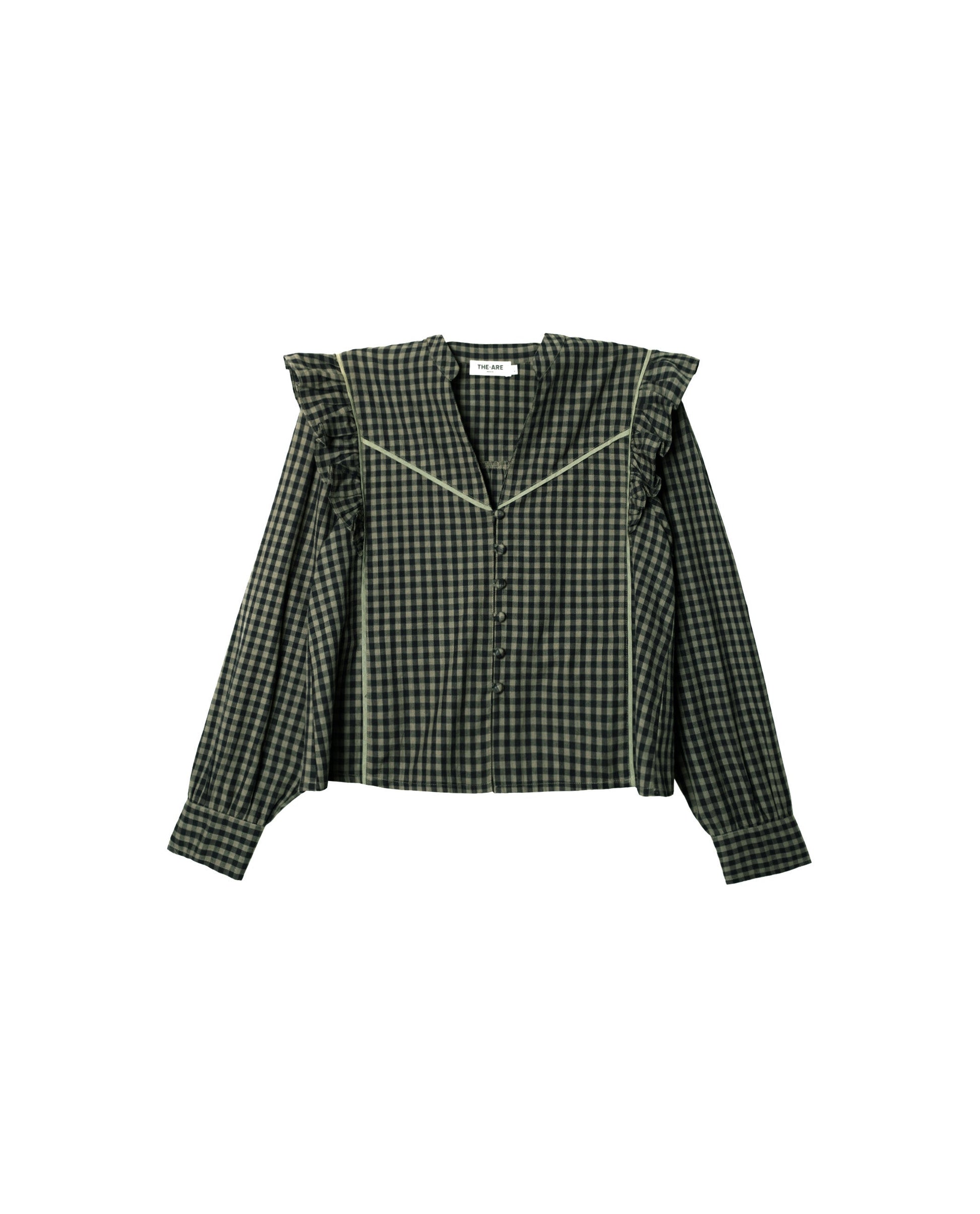Blusa con bieses y estampado de cuadros vichy verde[readmore]Blusa de cuadros vichy en verde militar, con bieses en liso. Cierre delantero con botones forrados. Manga larga con puño abotonado y volantes en los hombros. Forma parte del total look con pantalón a conjunto.