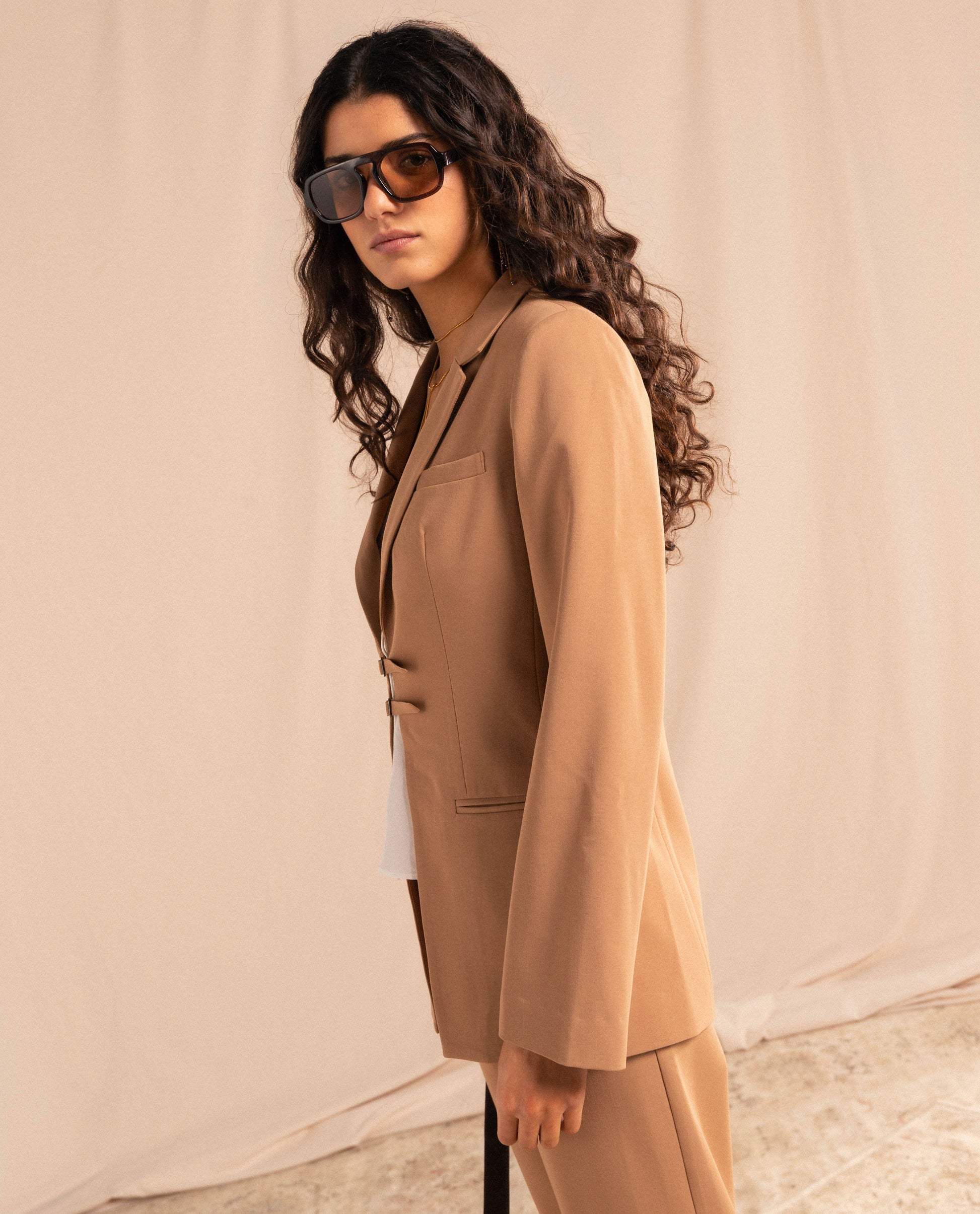 Queríamos diseñar el traje básico, pero con el toque THE-ARE. Esta blazer tiene el detalle que marca la diferencia: un cierre frontal con dos cintas y hebillas que rompe con lo clásico. Nuestro team de marketing está obsesionado con este total look, y no nos extraña. [sizes]La modelo de estudio mide 1.74 y lleva habitualmente la XS de top y 34 de pantalón. De esta blazer lleva la talla XS.