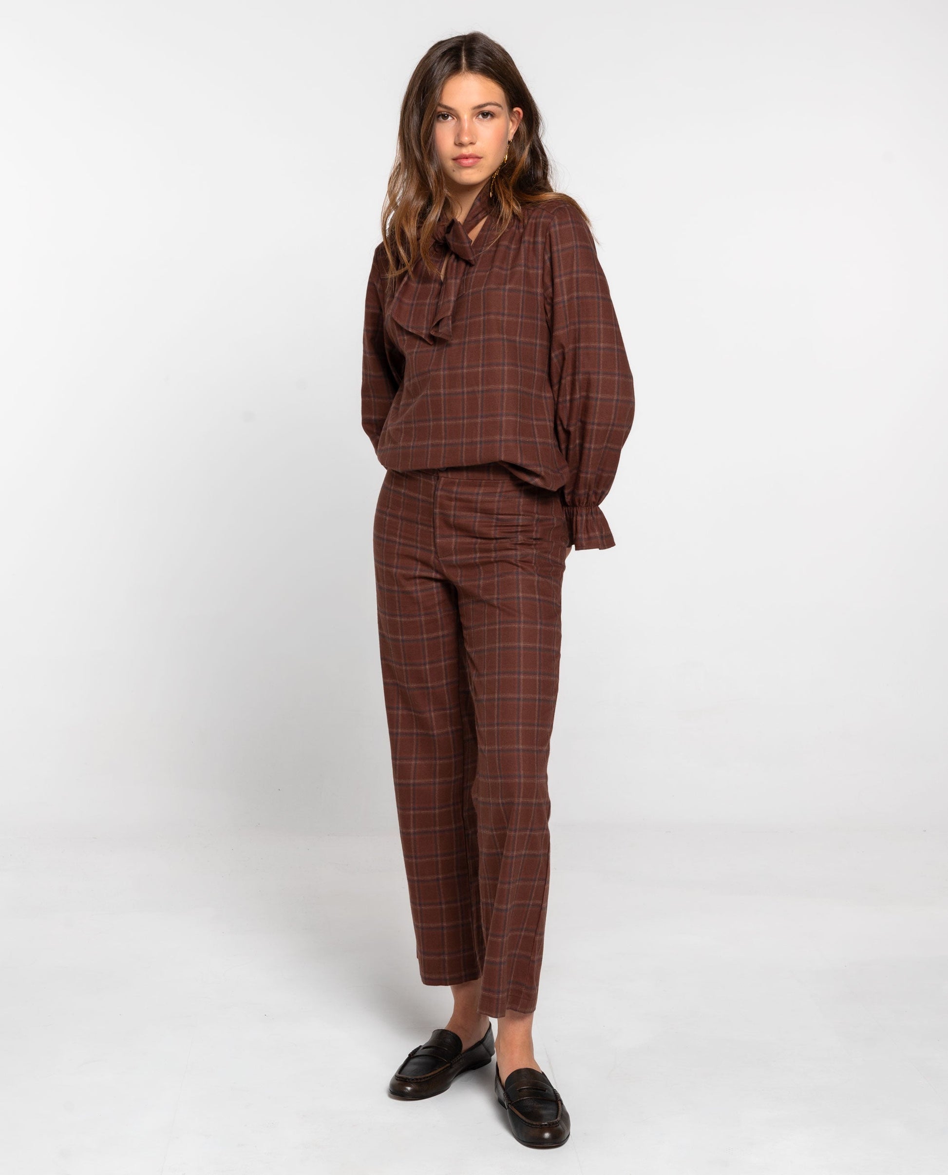 Blusa marrón de cuadros con lazada multiposición.[readmore]Blusa marrón con escote pico y lazada para anudar de diferentes maneras: con lazo, como collar o suelta. Manga larga con frunce elástico en la muñeca. Crea el total look con los pantalones City Crush o llévala con pantalones vaqueros.