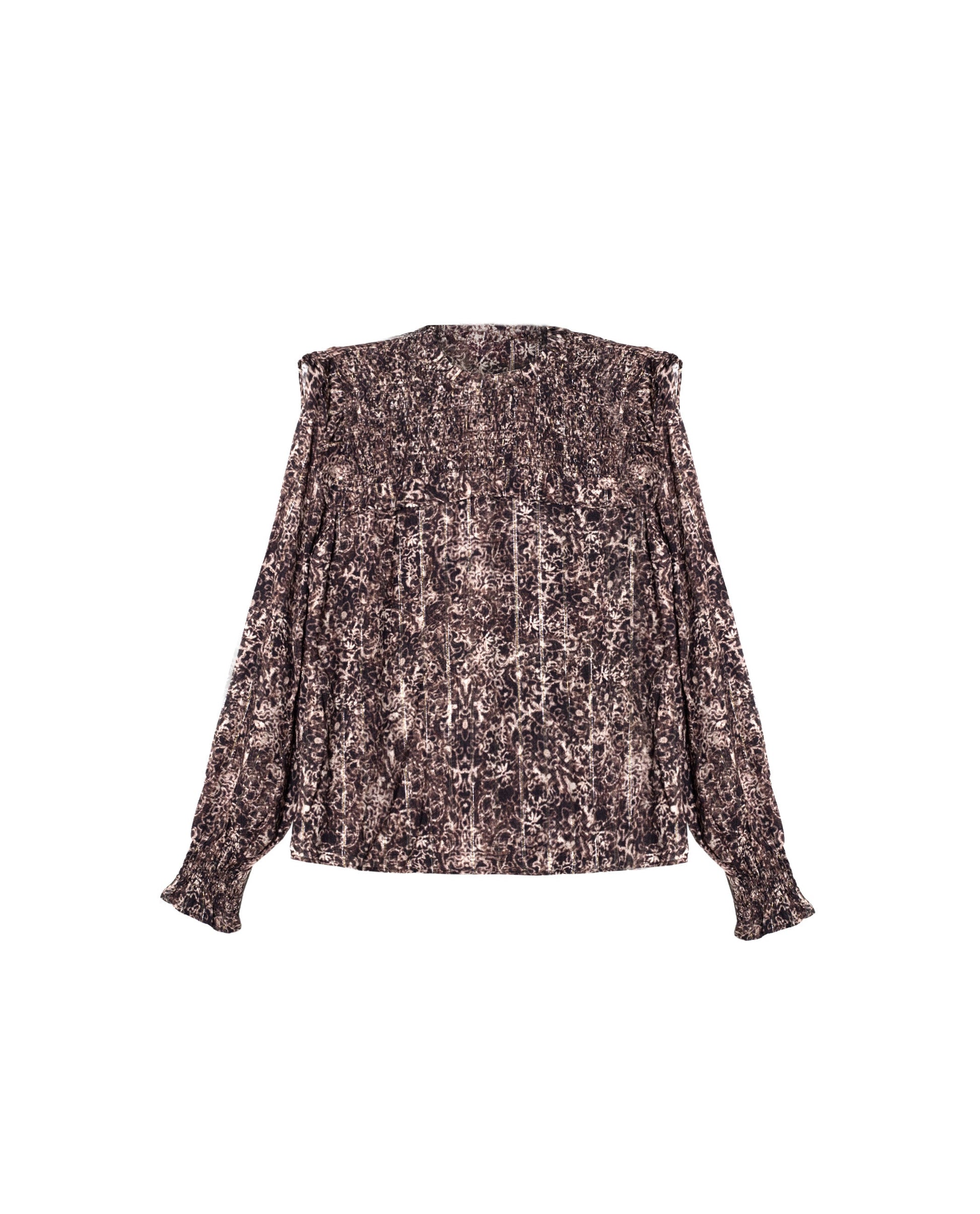 Blusa marrón estampada con volantes y nido de abeja.[readmore]Blusa estampada con nido de abeja en el delantero y volantes alrededor del canesú. Manga larga con puños rematados en volante y abertura trasera en forma de gota con botón. Combínala con la falda a conjunto para hacer un total look o con vaqueros.