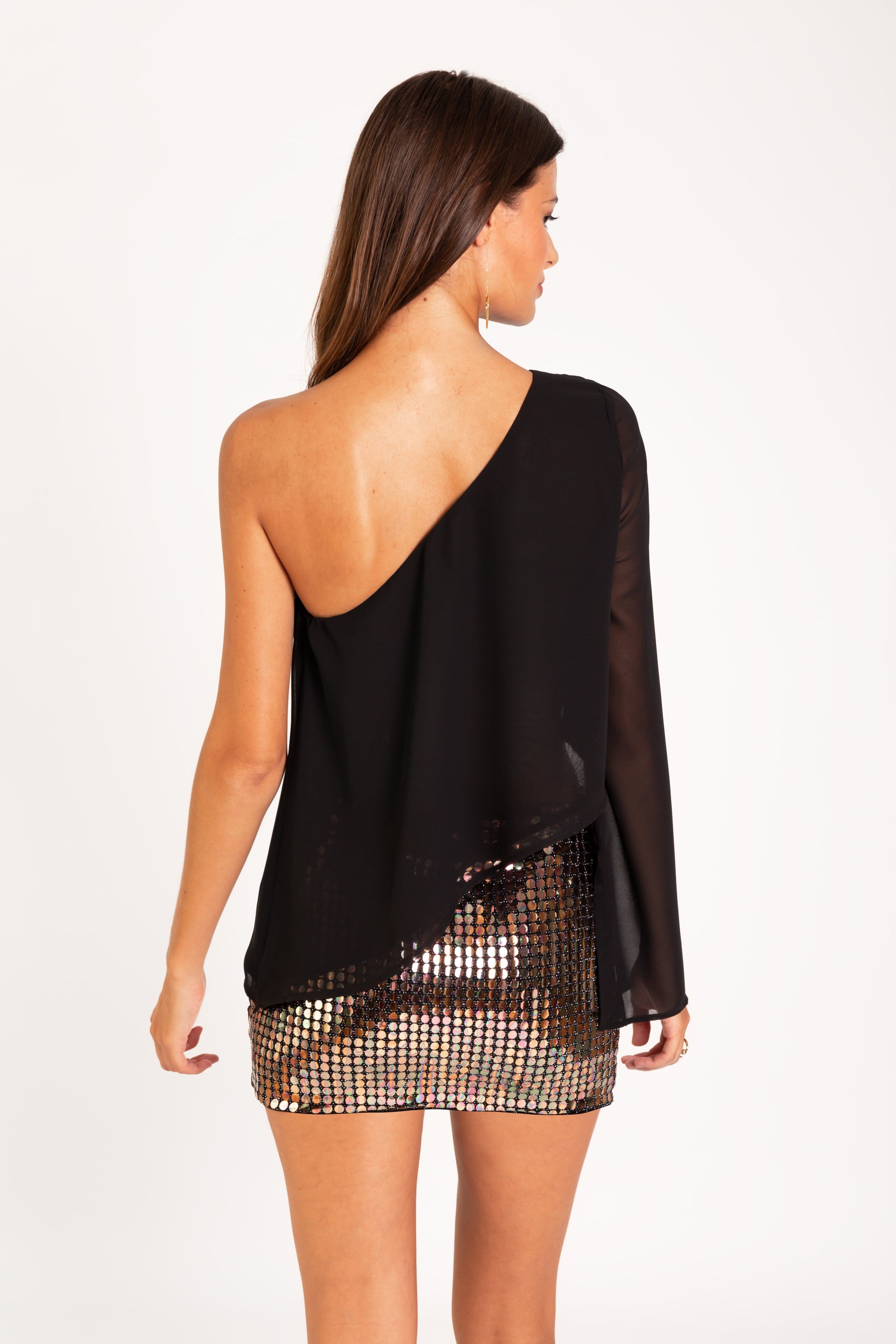 - Blusa asimétrica negra con vuelo.