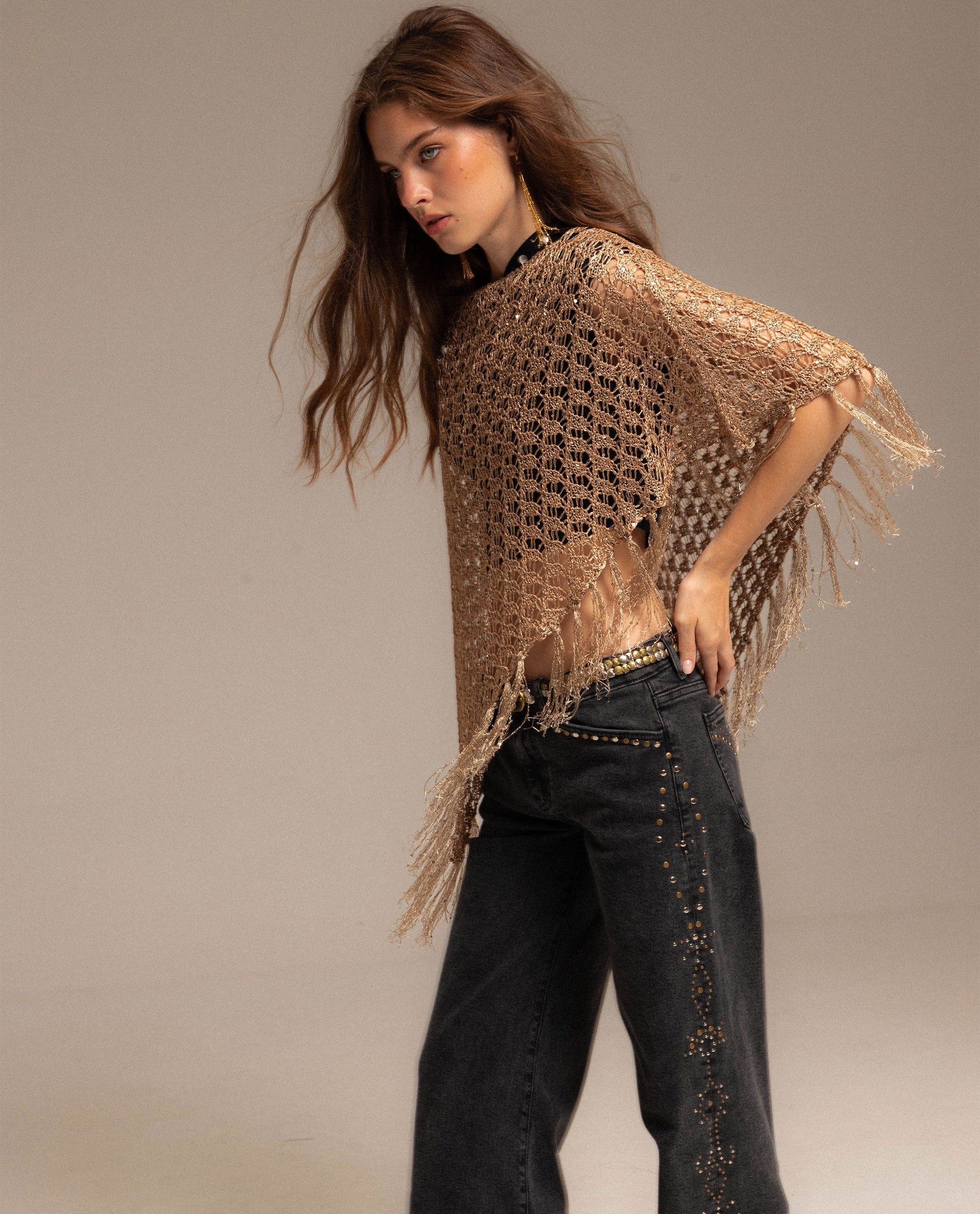 Capa de pico con flecos y acabado brillante.[readmore]Esta capa sin duda es la pieza ideal para completar cualquier look con un toque de brillo sutil y divertido. Confeccionada con un hilo especial que incorpora pequeñas lentejuelas, su acabado aporta luz de forma delicada sin recargar. Su corte en pico estiliza la silueta y le da ese toque trendy al diseño, junto con los flecos largos que aportan movimiento a cada paso. Es una prenda súper versátil pensada para eventos, noches especiales o para elevar tus looks más sencillos. Se adaptará a tu estilo en cada uno de tus looks!