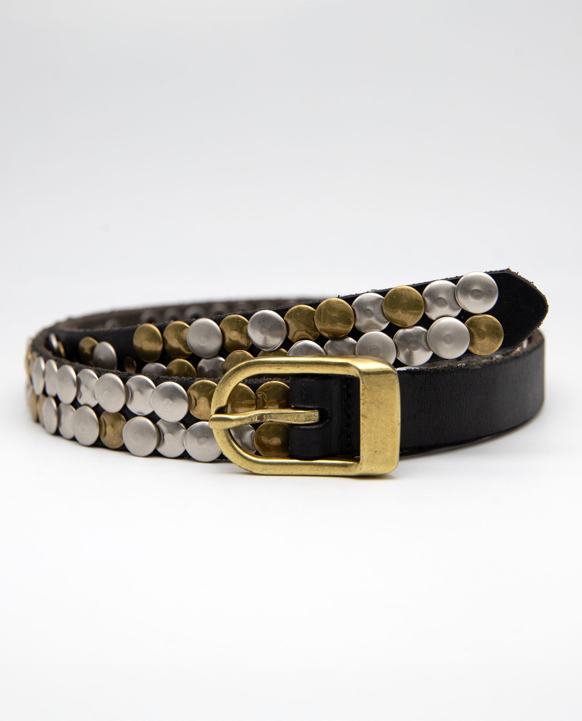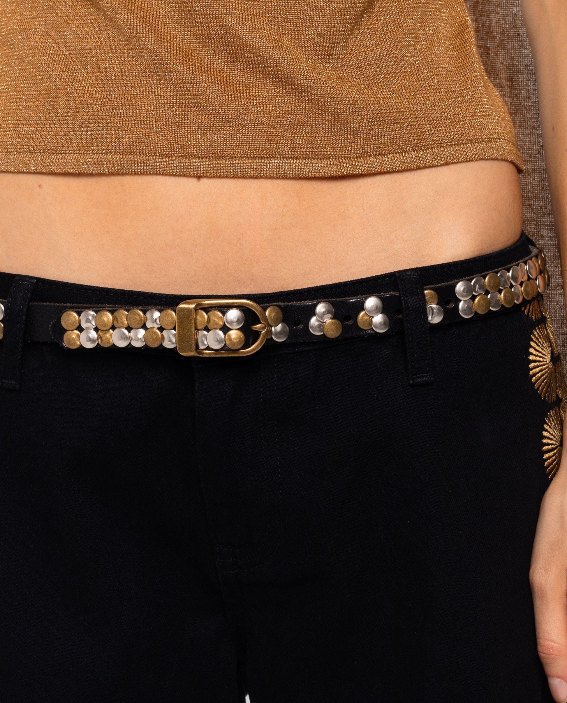 Cinturón negro con detalles metálicos.[readmore]El Cinturón Chloe da ese toque especial que transforma tu look sin complicaciones. Más fino que los cinturones habituales, se ajusta con facilidad y aporta un punto cañero gracias a sus tachuelas metálicas en dorado y plateado. El diseño juega con la disposición de las tachuelas para crear una combinación visual original y elegante. ¿Te atreves a llevarlos?