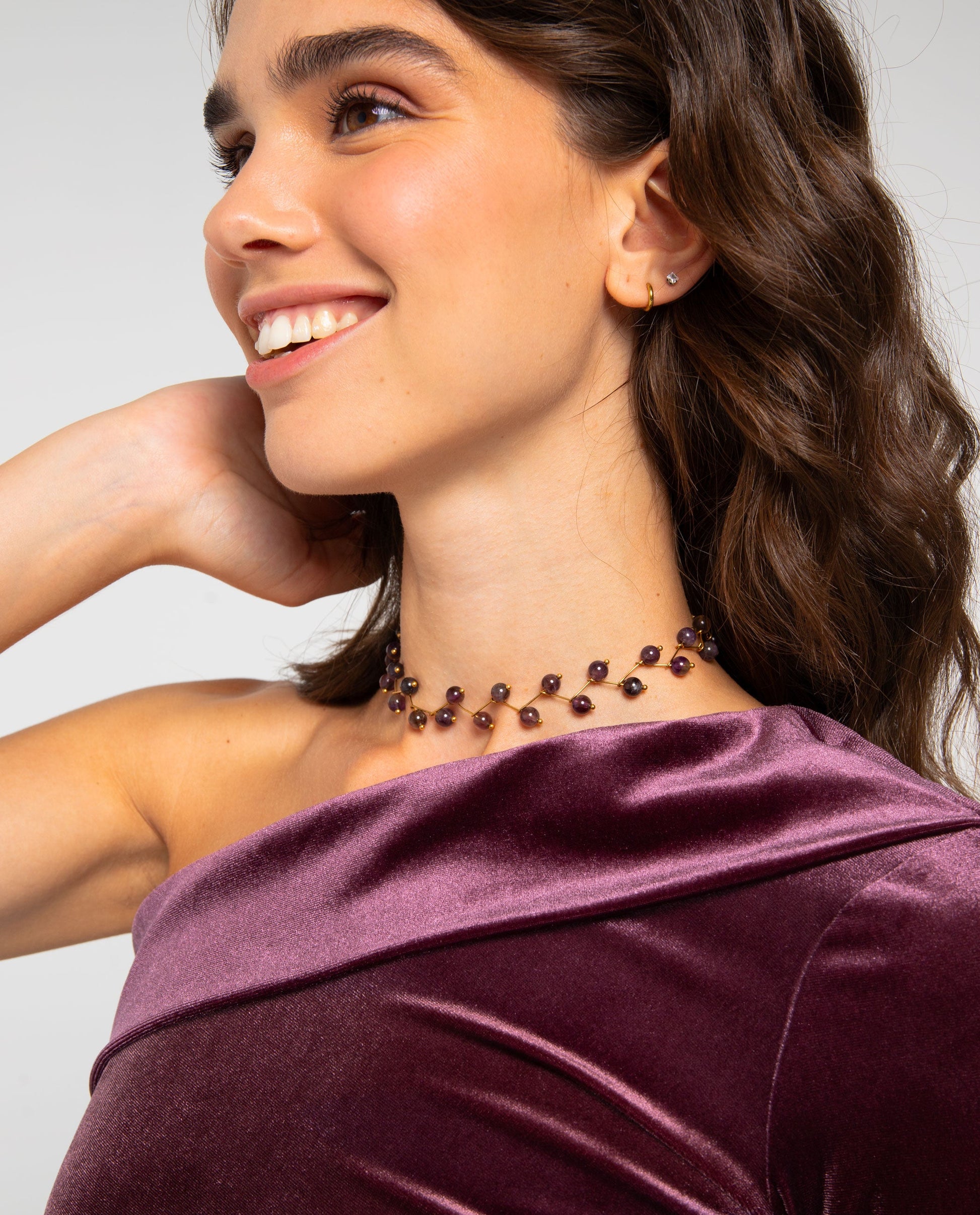 - Choker dorado con piedras moradas.