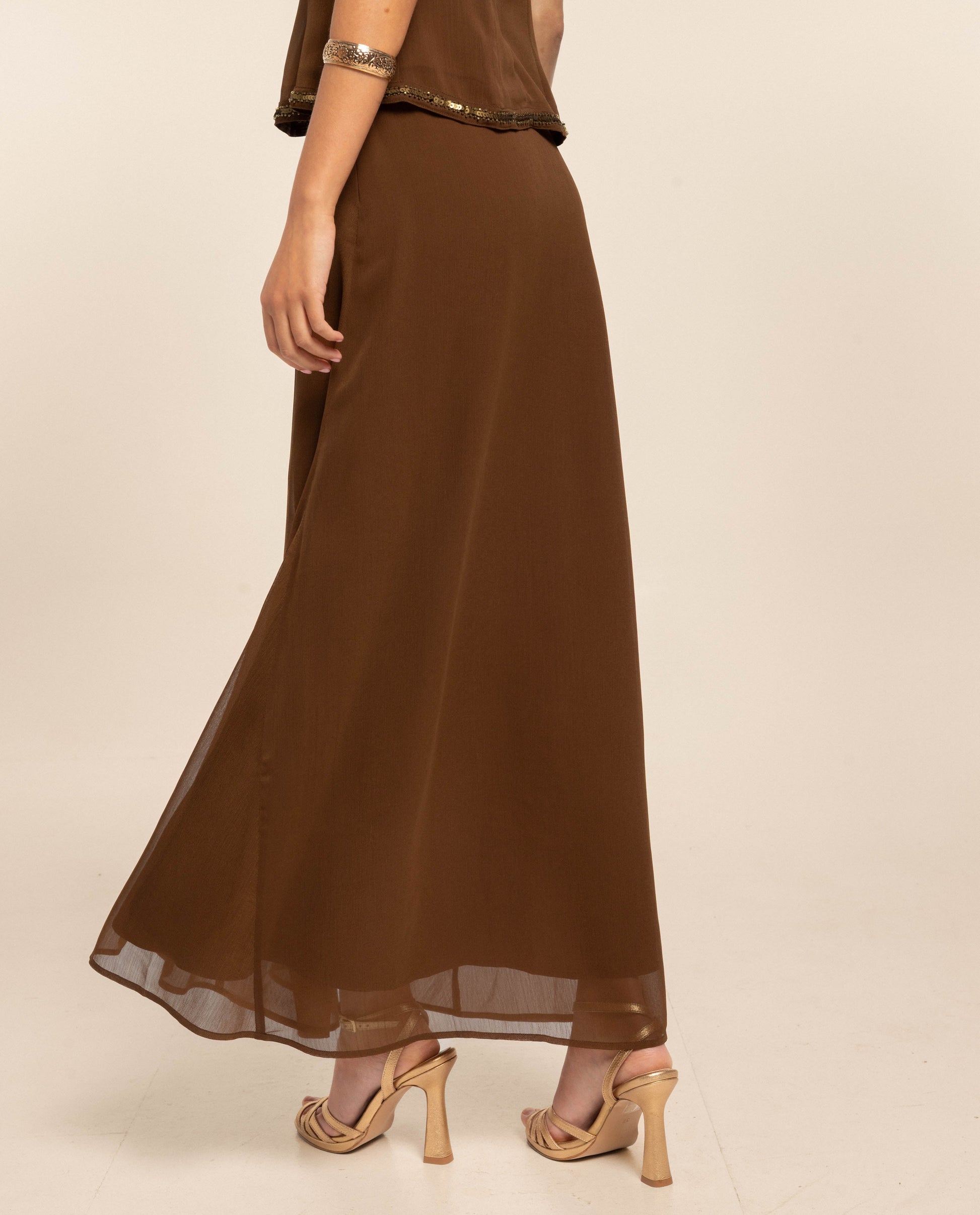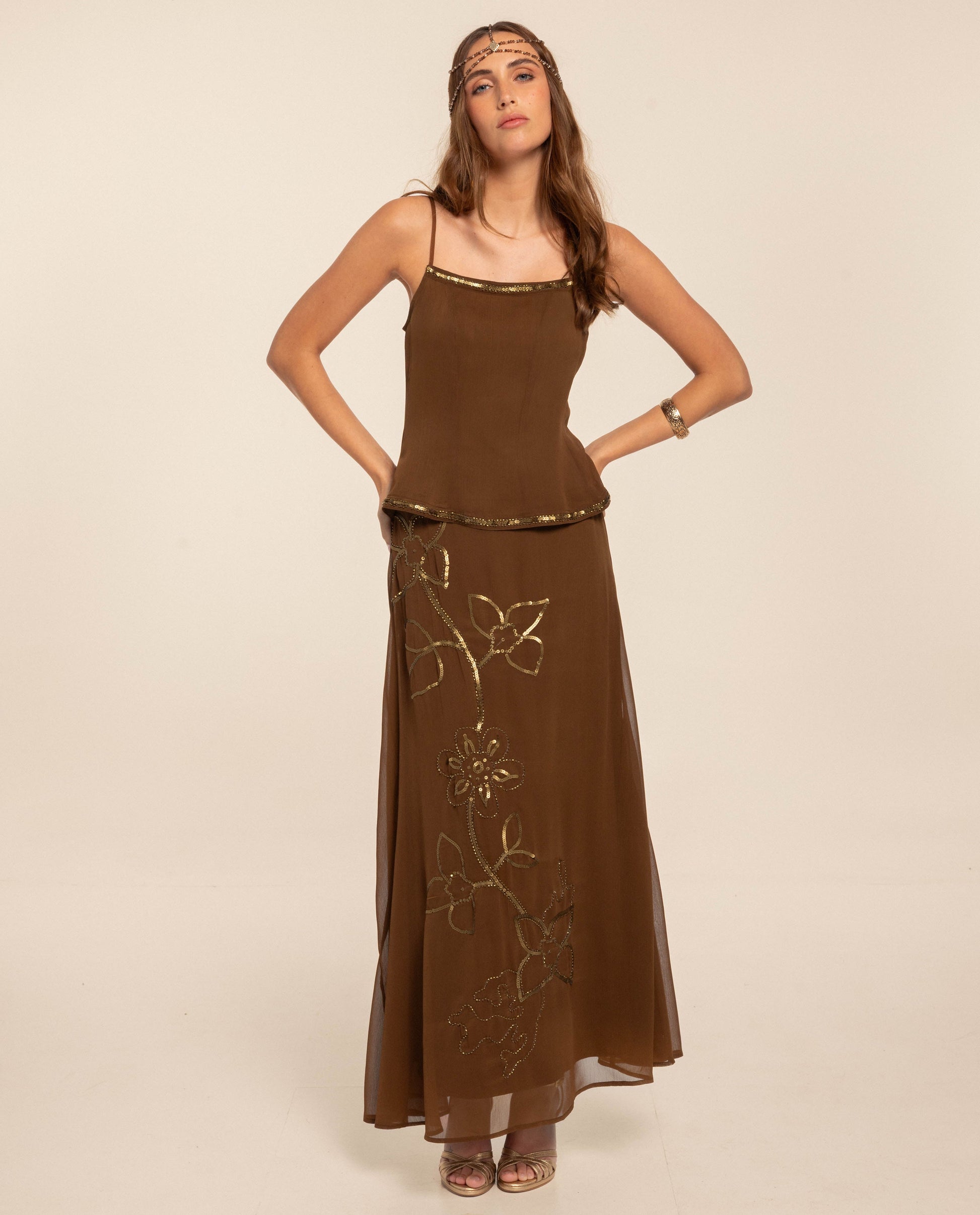 Falda midi con bordado de lentejuelas y abalorios [readmore] Lo que la hace especial es el bordado floral de lentejuelas y abalorios. Tiene una caída increíble y está completamente forrada para que te sientas cómoda. El cierre es de cremallera invisible y lleva corchetes para que el ajuste sea perfecto y fácil de poner. Este total look con su top a juego es una opción ganadora. [sizes] La modelo de estudio mide 1,72m. Lleva la talla 34 de pantalón y la XS de top. De esta falda lleva la talla XS.