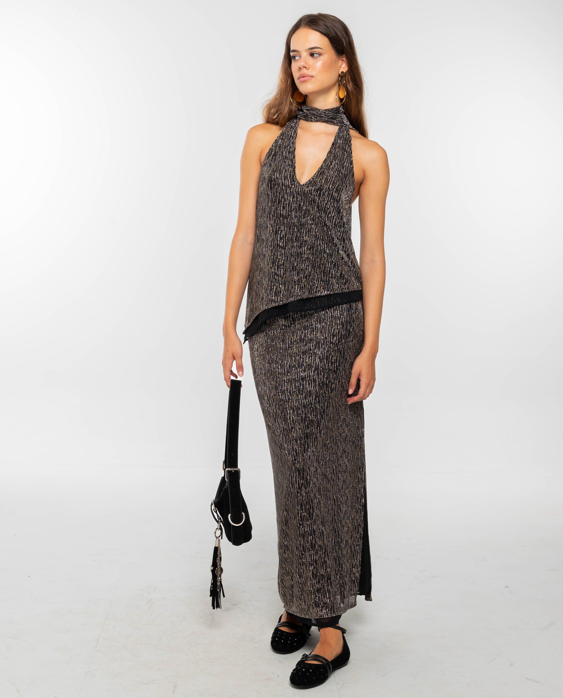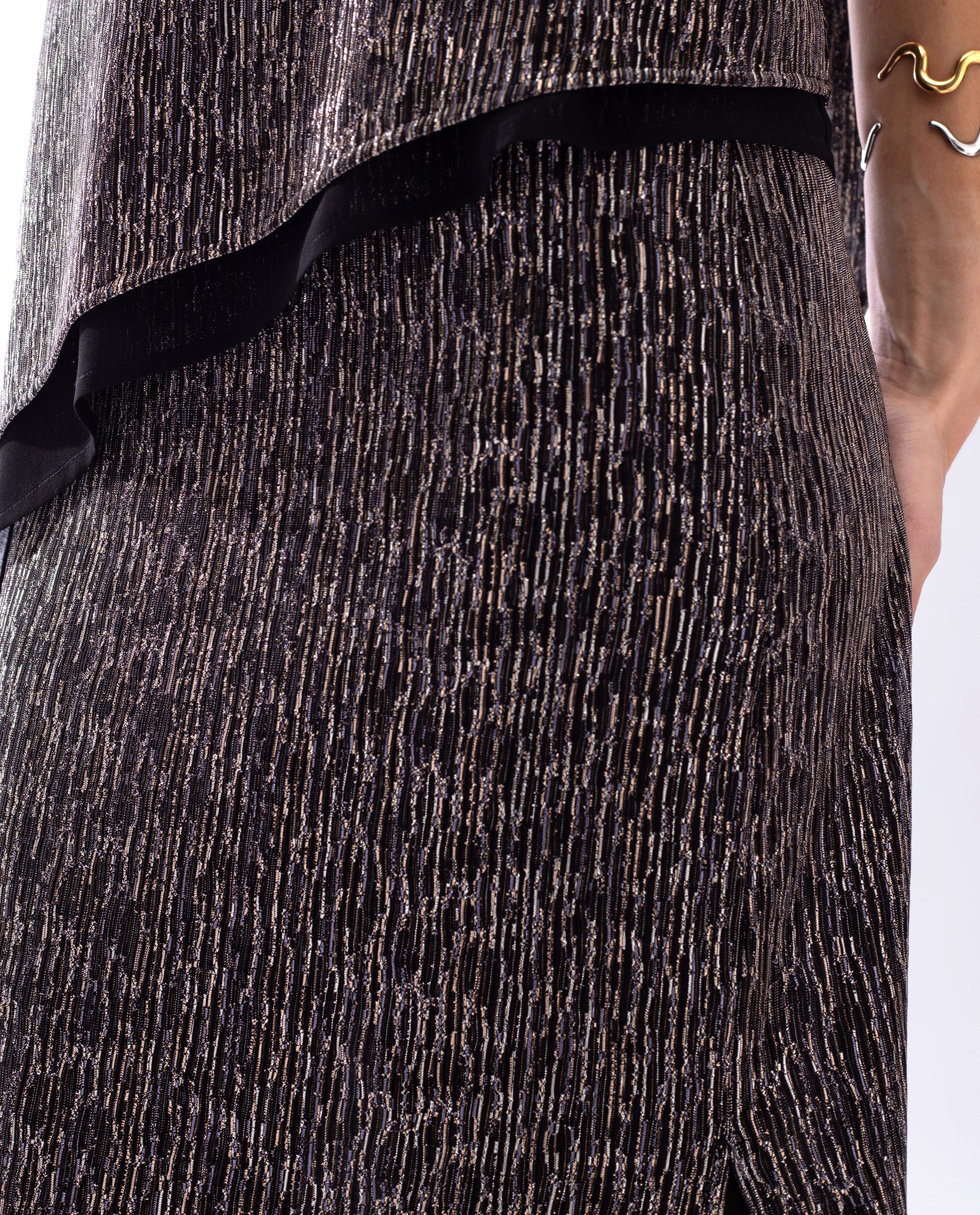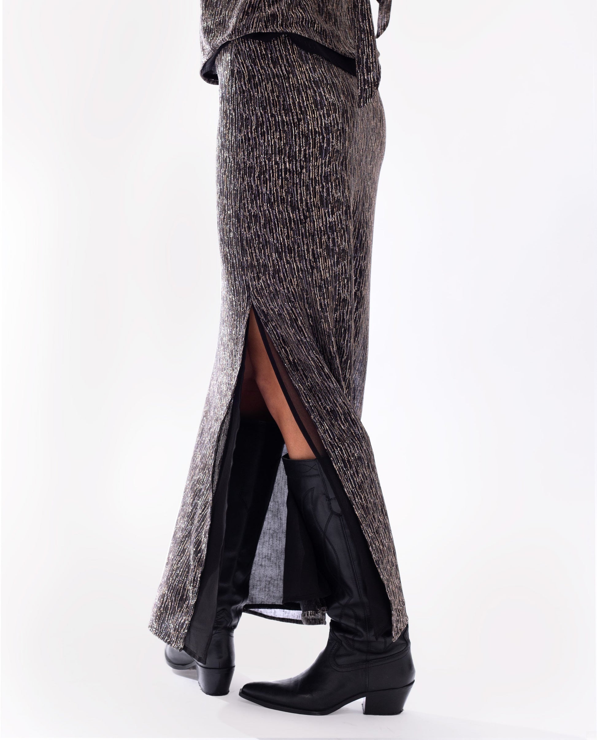 Falda midi con brillo.[readmore]Este conjunto será tu aliado para los planes más especiales. La clave está en la versatilidad: puedes llevar cada pieza en conjunto o separada para lograr diferentes looks. Confeccionada en un tejido semitransparente con brillos en negro, dorado y plata, esta falda recta tiene una abertura lateral y el forro más largo, creando un efecto de superposición. Lleva goma elástica en la cintura para un ajuste cómodo y perfecto. Es la elección ideal para lucir sofisticada en estas fiestas.