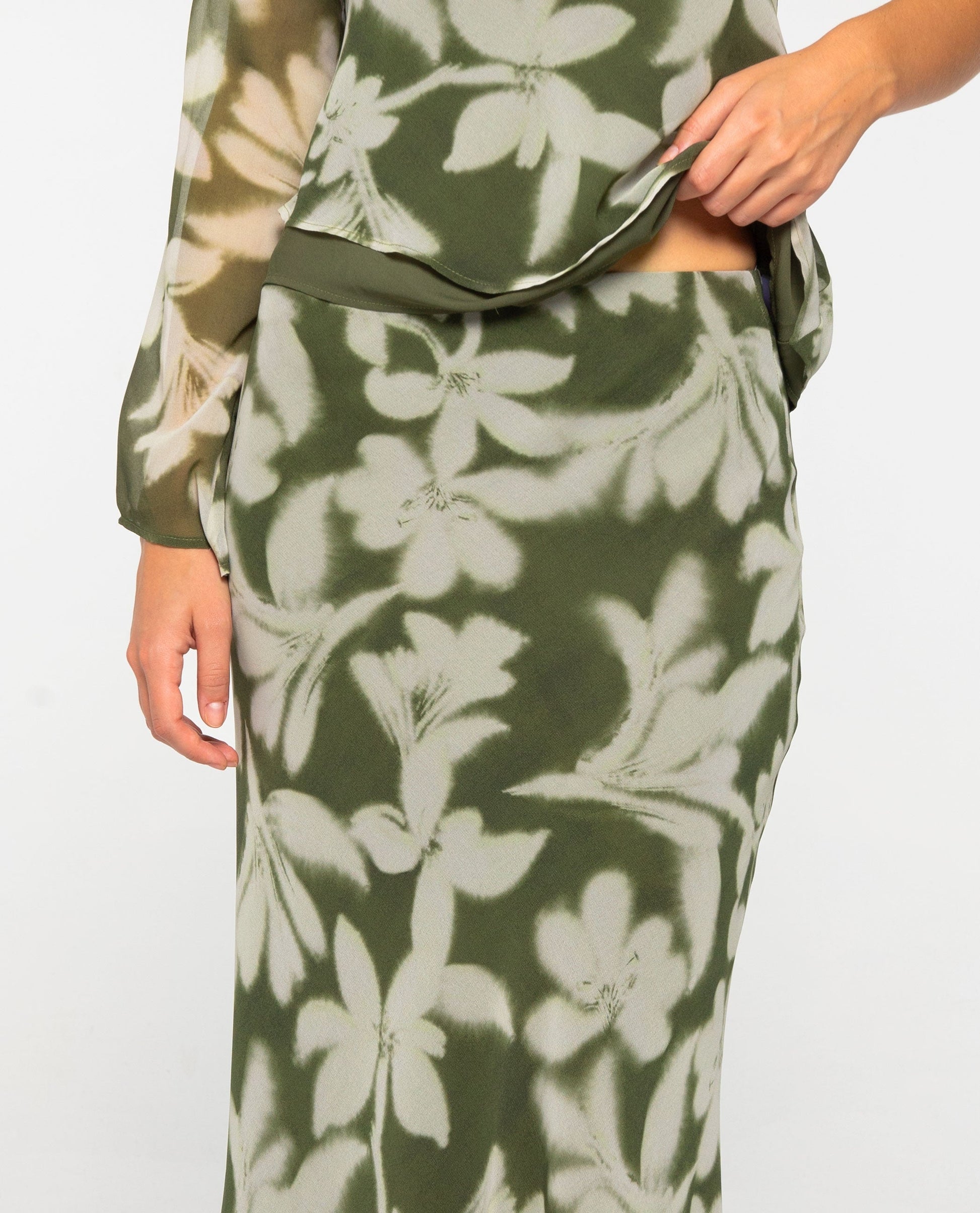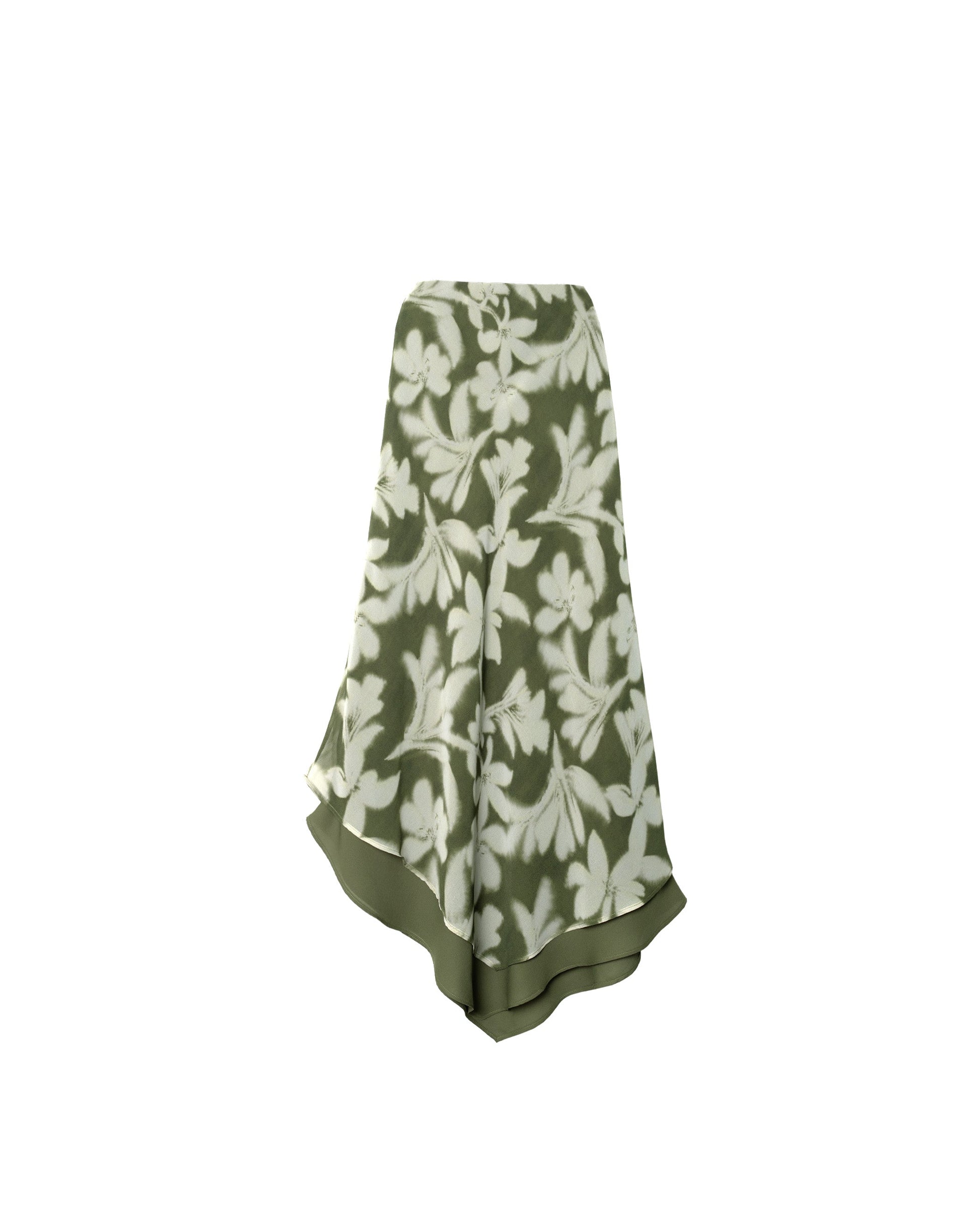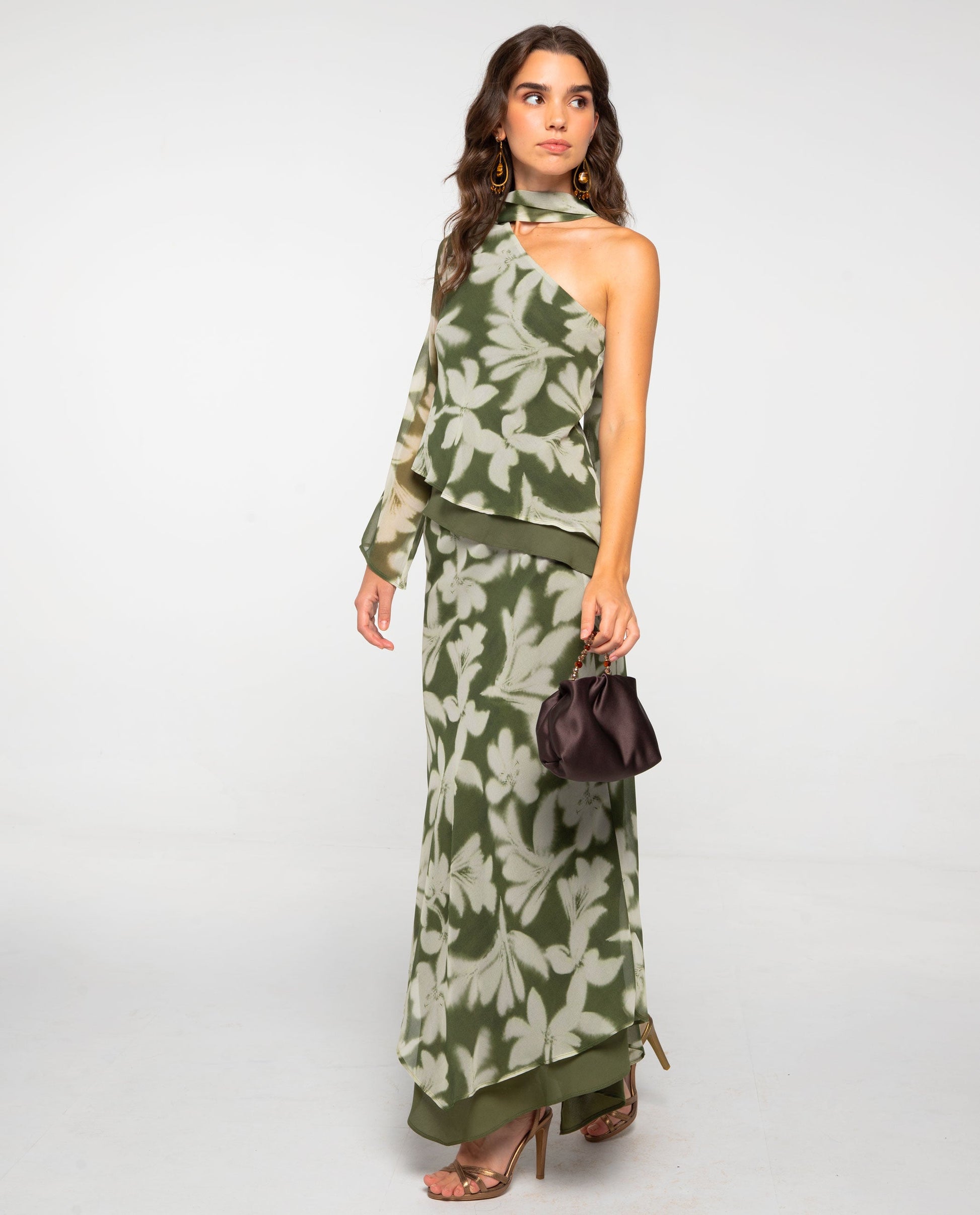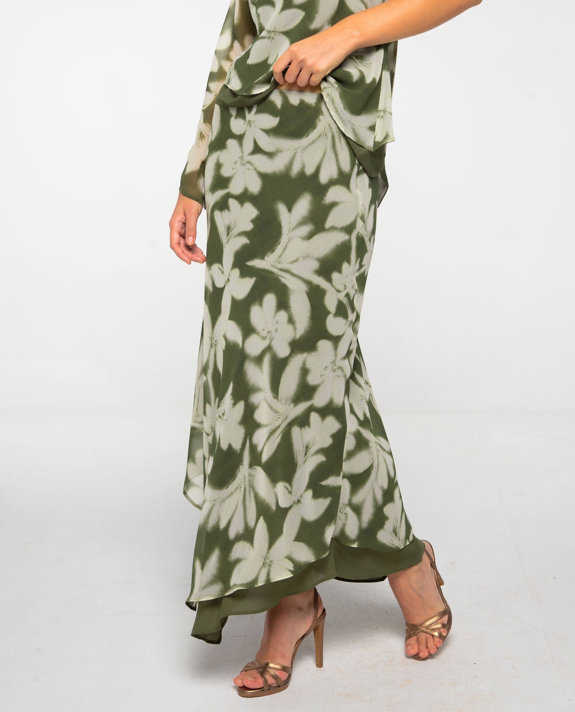 Falda midi asimétrica con estampado de flores verde y beige.[readmore]Este set de blusa y falda de invitada está confeccionado en gasa con un estampado único en tonos verdes y beige. La capa interior es lisa, y se asoma para crear un efecto contraste. El corte al biés hace que se adapte a ti. sigue la tendencia de las líneas en contraste con este total look tan estiloso.