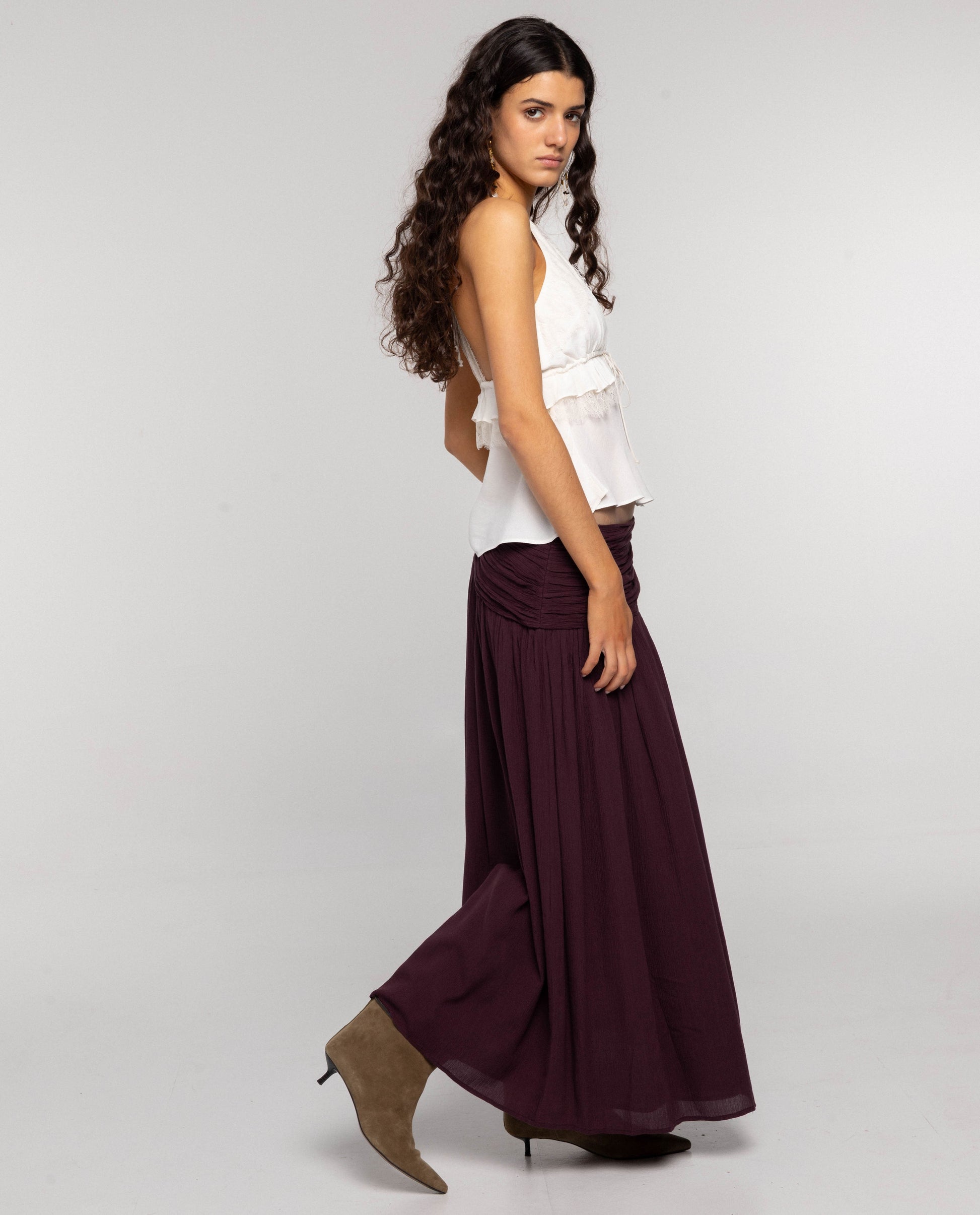 Falda de bámbula ciruela [readmore] La hemos diseñado con fajín drapeado asimétrico que crea un juego de volúmenes con toque boho. Tiene cremallera invisible en el lateral y va forrada. [sizes] La modelo de estudio mide 1,74 y lleva habitualmente la XS de top y 34 de pantalón. De esta falda lleva la talla XS.