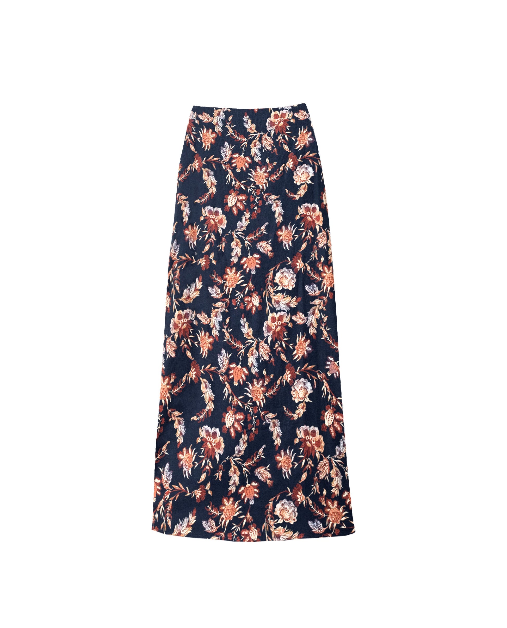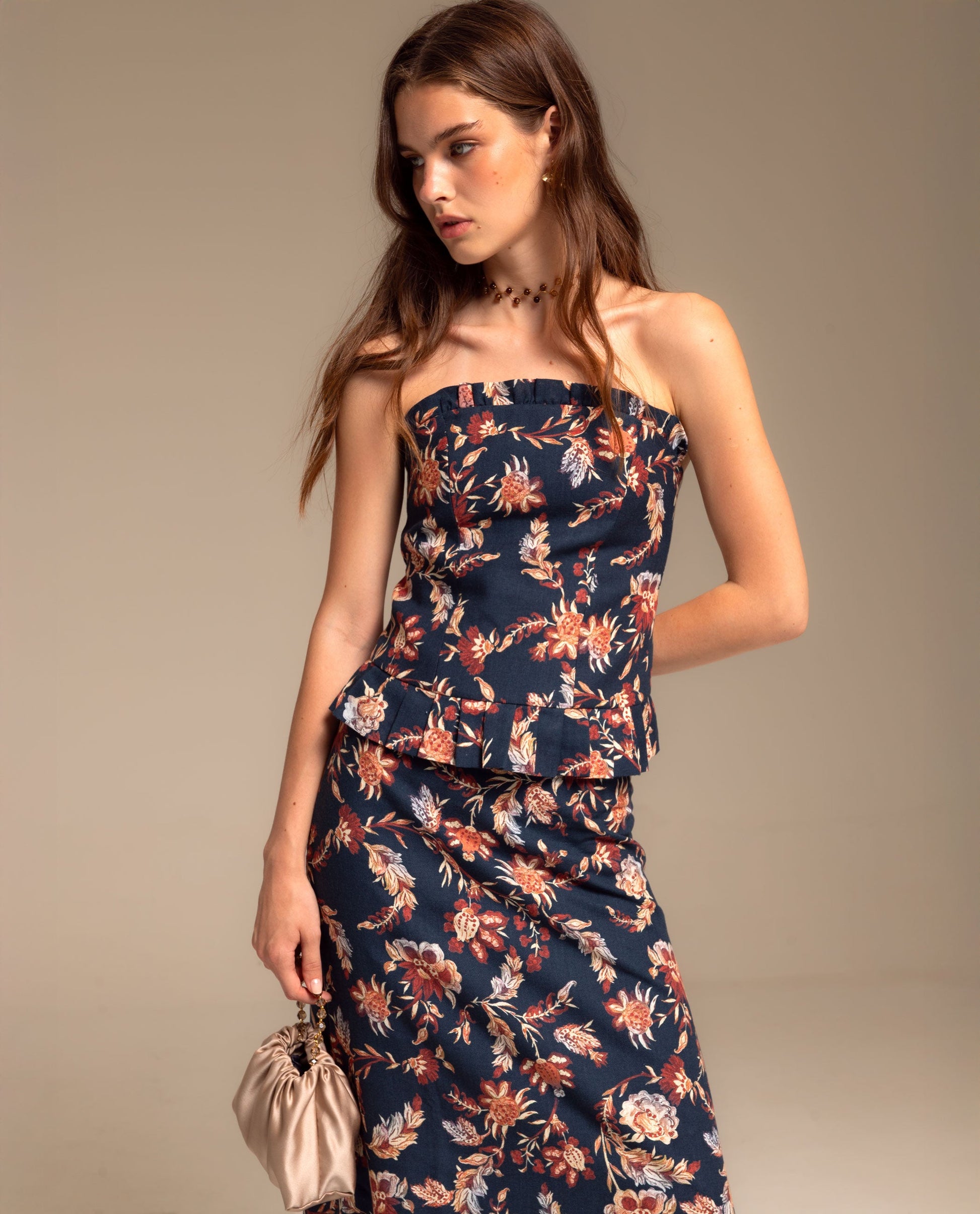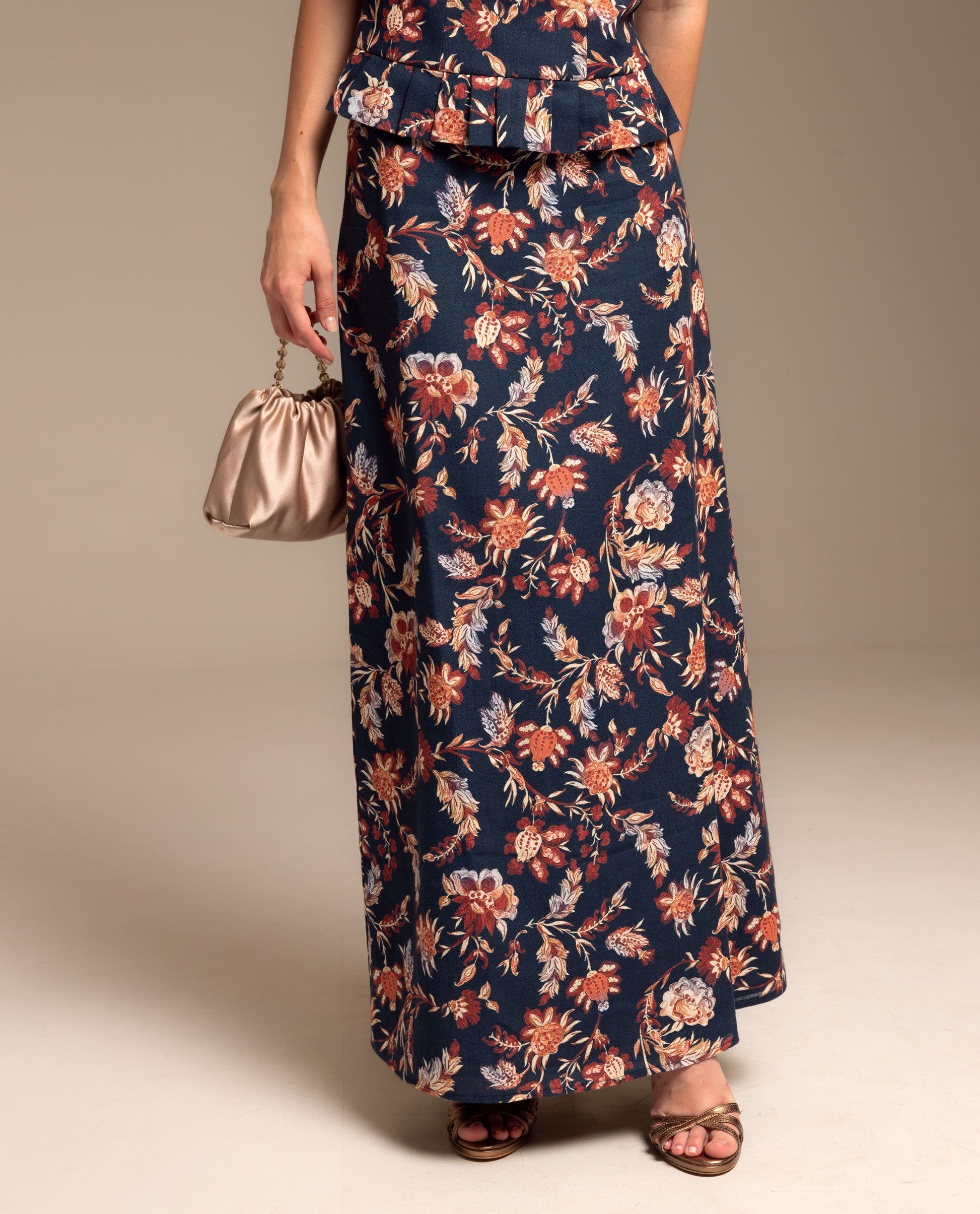 Falda midi con estampado floral en azul marino.[readmore]Esta falda tiene ese corte que siempre sienta bien: fluida, con movimiento y con un punto elegante. Forma muy favorecedora y la cremallera invisible trasera hace que quede perfecta. Su tejido ligero y el estampado floral sobre fondo teja la convierten en una opción ideal para cualquier evento. Queda espectacular con el top a conjunto, pero también puedes llevarla con otros para sacarle aún más partido. ¡Una prenda todoterreno para invitadas!