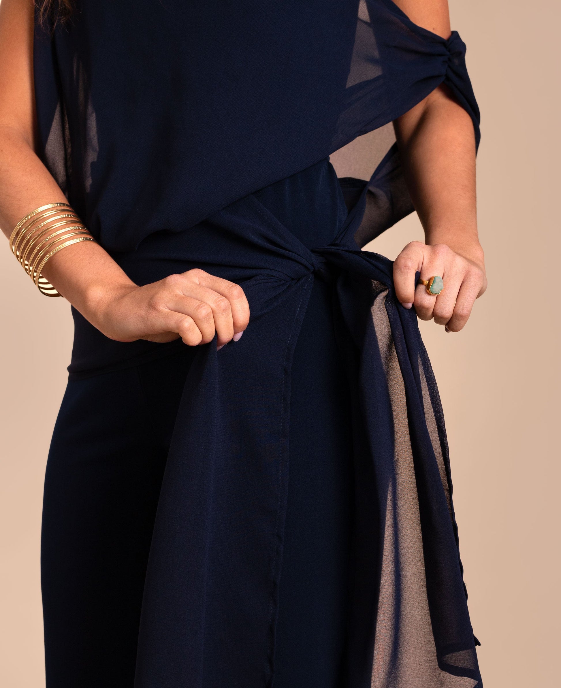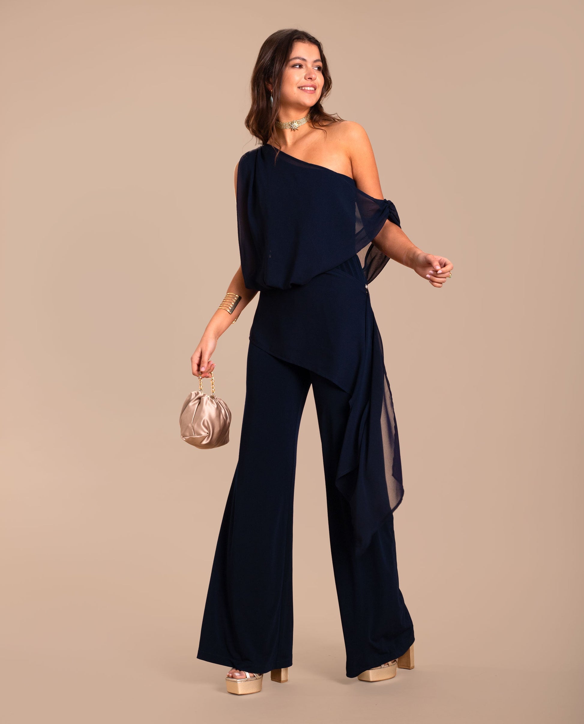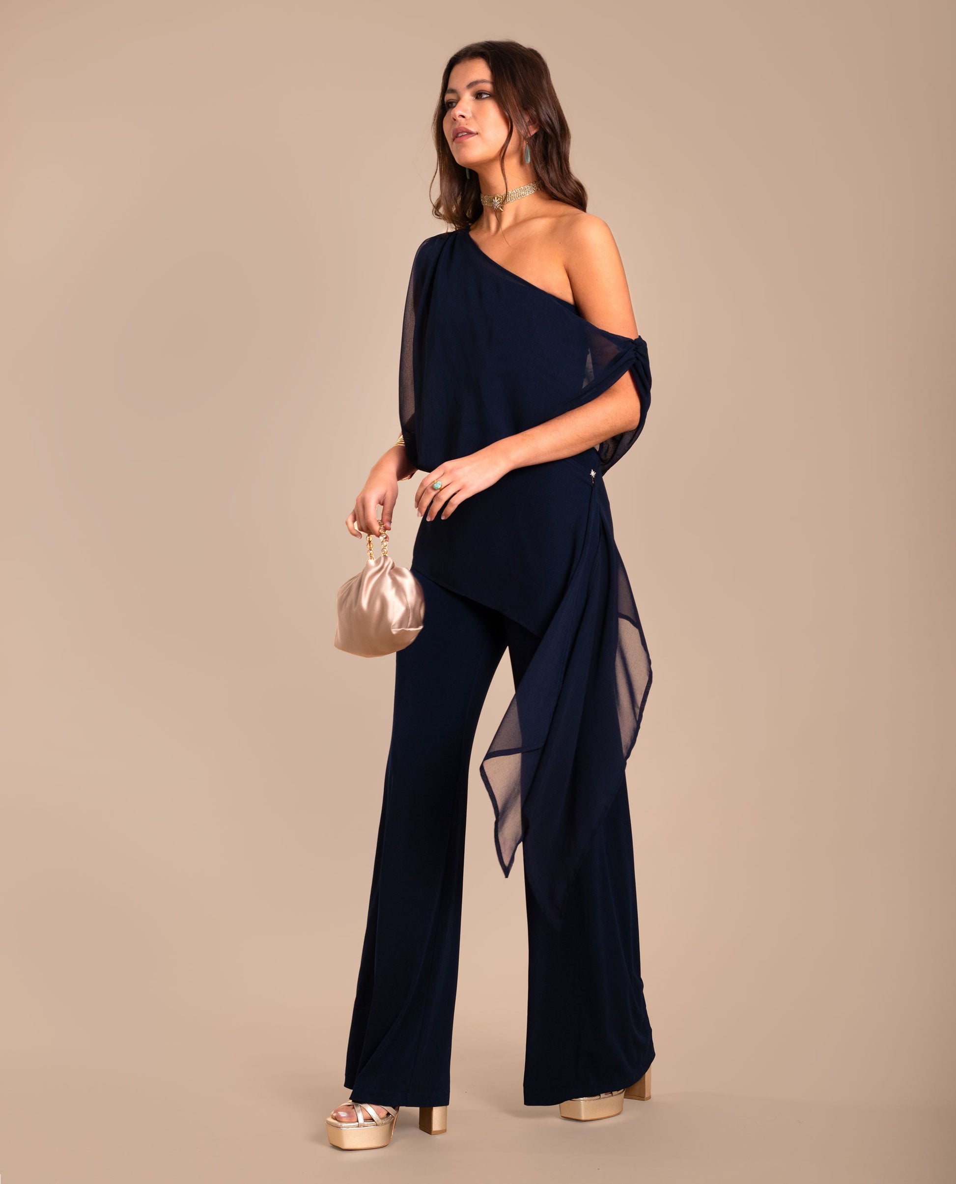 Mono de punto y gasa multiposición.[readmore]Si buscas un diseño original, este mono es perfecto para ti. Confeccionado en un tejido de punto elástico, su detalle más especial es la gasa multiposición que envuelve el cuerpo y puedes llevar de diferentes formas según el estilo que quieras: desde un look más estructurado hasta uno más relajado. La versatilidad de este mono permite adaptarlo a distintas ocasiones, combinando perfectamente con accesorios dorados o toques de color.