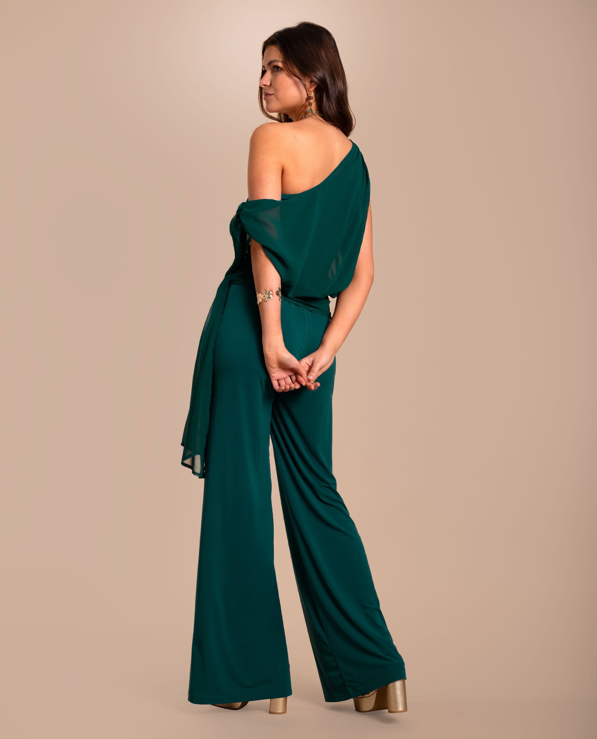 Mono de punto y gasa multiposición.[readmore]Si buscas un diseño original, este mono es perfecto para ti. Confeccionado en un tejido de punto elástico, su detalle más especial es la gasa multiposición que envuelve el cuerpo y puedes llevar de diferentes formas según el estilo que quieras: desde un look más estructurado hasta uno más relajado. La versatilidad de este mono permite adaptarlo a distintas ocasiones, combinando perfectamente con accesorios dorados o toques de color.