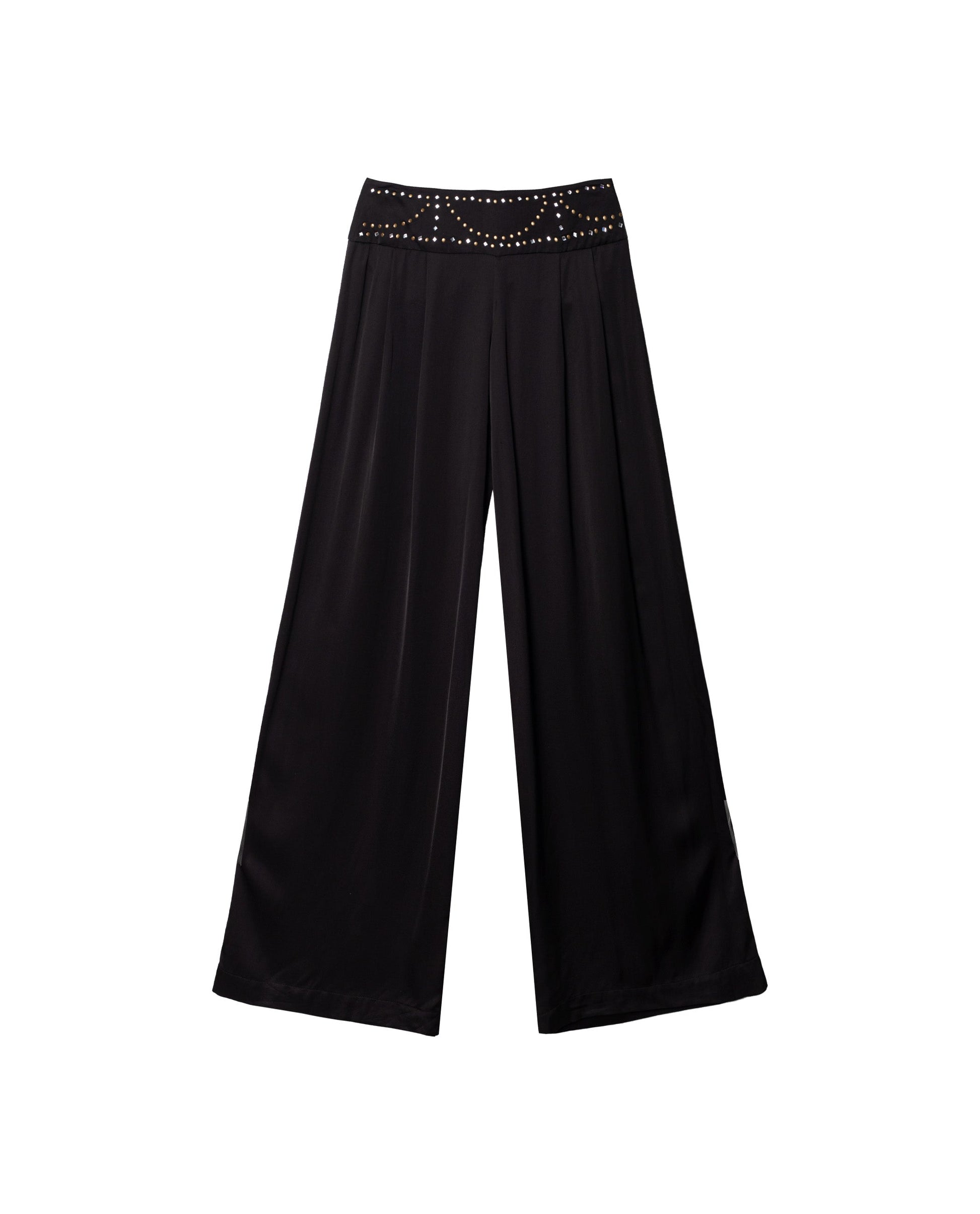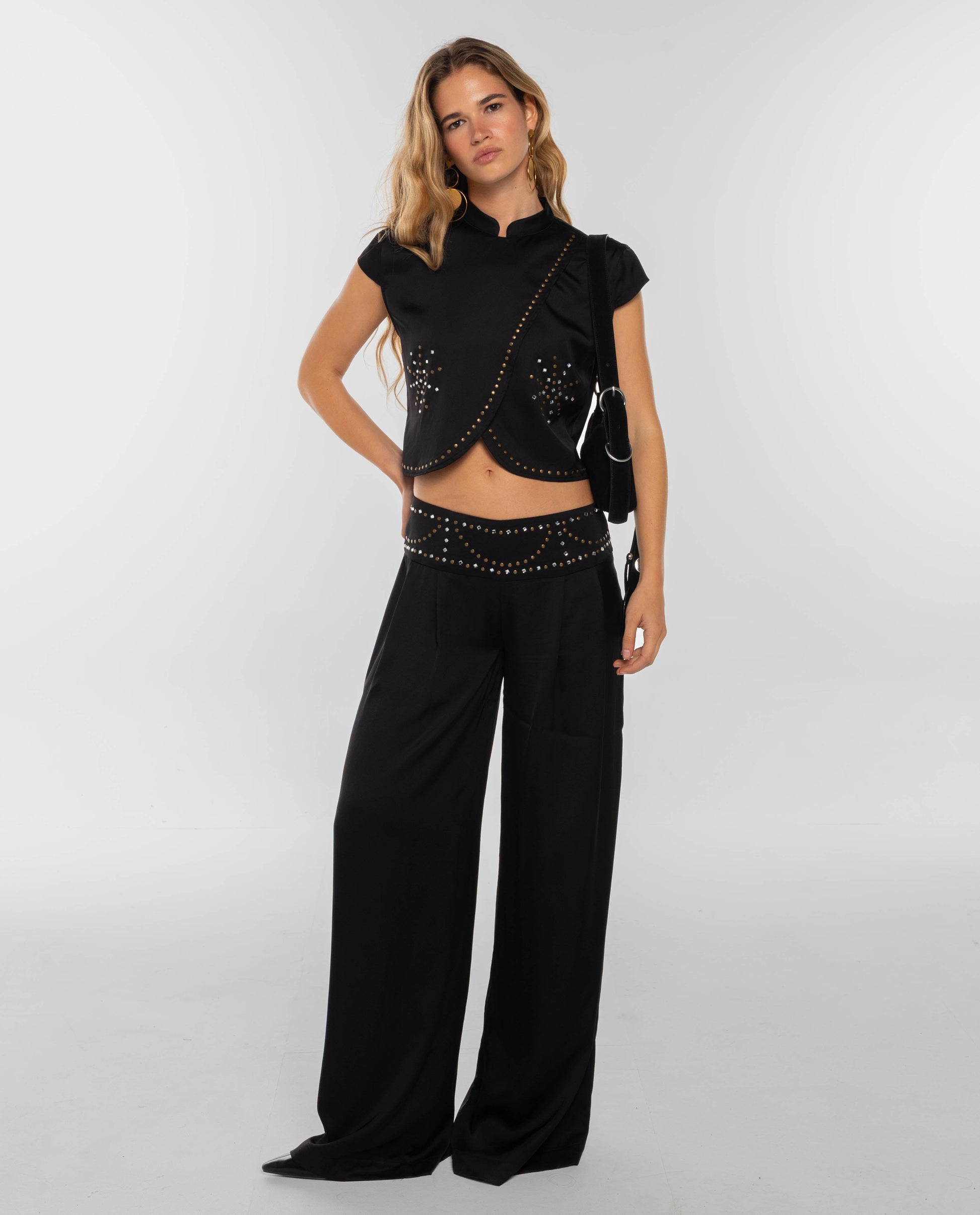 Pantalón en satén negro con canesú con apliques.[readmore]Nos flipan los pantalones de este look. Los hemos diseñado con un canesú decorado con apliques en plata y dorado viejo. El corte del pantalón es con pata ancha y con tiro bajo. Se cierra con cremallera invisible en la espalda. Tiene top a junto para crear un lookaso ideal para salir en tu próxima fiesta.[sizes]La modelo de estudio mide 1.74 y lleva habitualmente la XS de top y 34 de pantalón. De este pantalón lleva la talla XS.