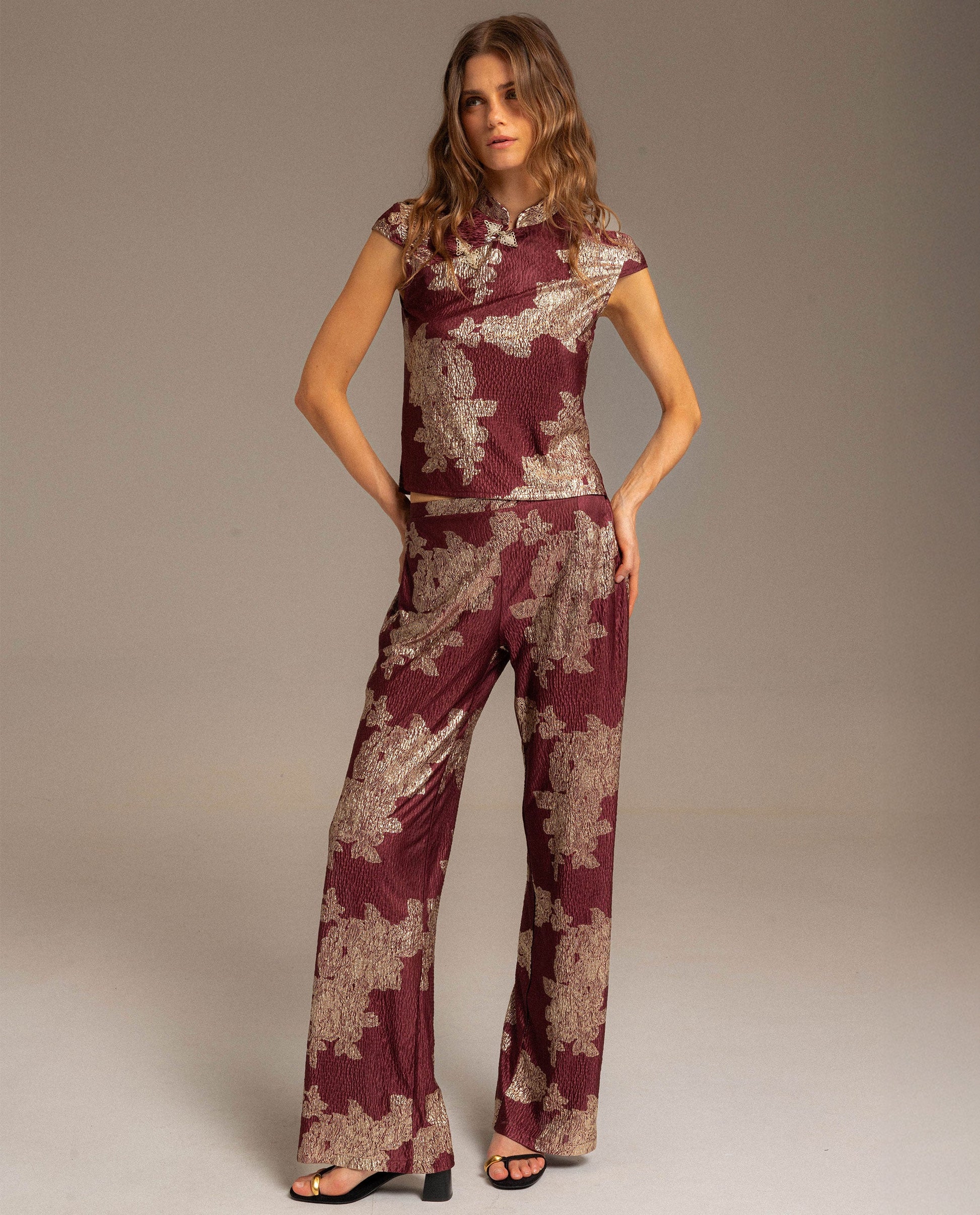 Pantalón burdeos con estampado jacquard.[readmore]Si buscas un look especial, este conjunto de top y pantalón lo tiene todo. Confeccionado con tejido jacquard satinado con motivos orientales que le da un toque especial, y el escote cerrado con abertura lateral de alamares del top es el toque de estilo perfecto. Los pantalones tienen el corte perfecto para convinar comodidad y estilo: recto, fluído y con goma en la cintura. Sin duda es el conjunto perfecto para ser la más cool de la fiesta. Combínalo con complementos en dorado para conseguir el look perfecto.