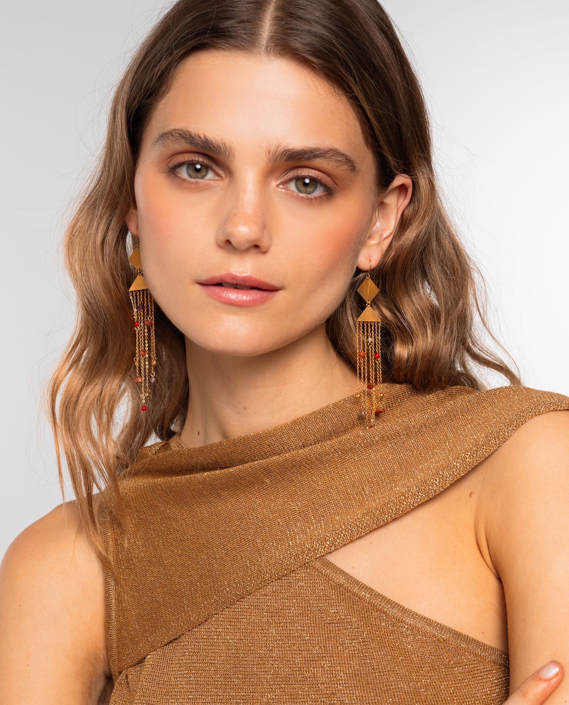 - Pendientes largos con flecos dorados.