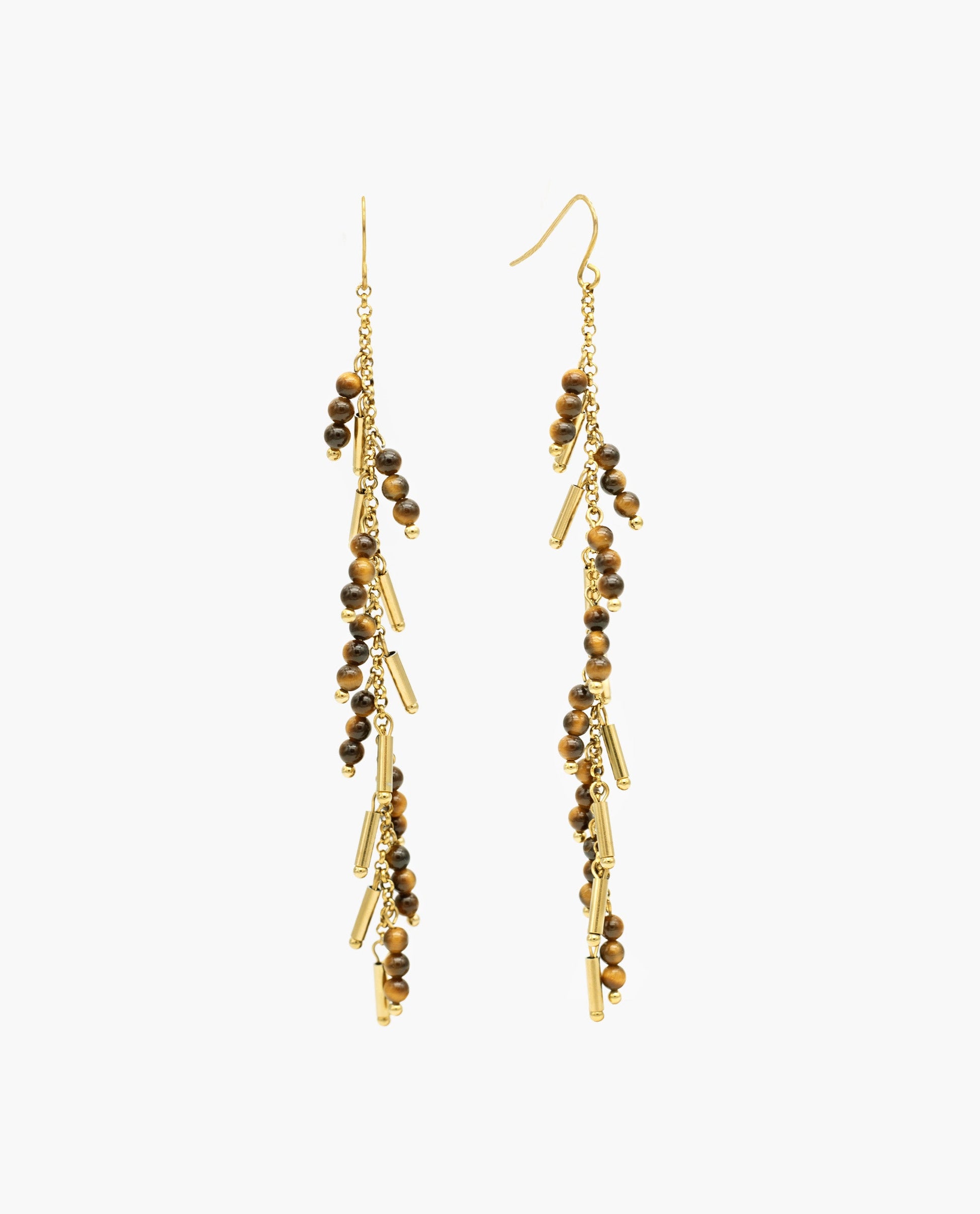 Pendientes largos con canutillos dorados y cuentas marrón. [readmore]Pendientes largos tipo cascada con tira combinada de canutillos dorados y cuentas marrón. Cierre de gancho. Estilo boho.