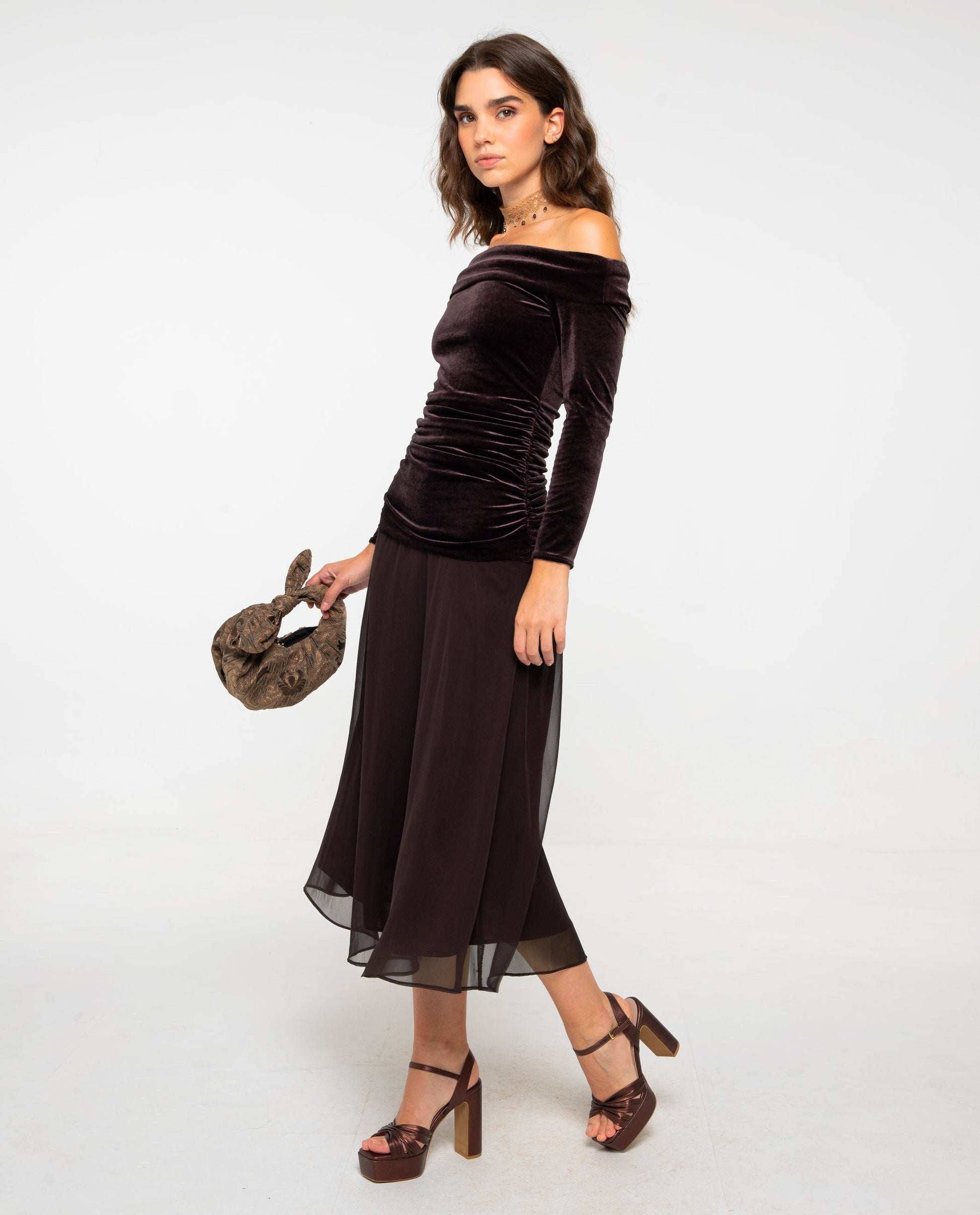 Sandalia en piel marrón de tacón ancho con plataforma.[readmore]Sandalias de piel marrón con plataforma y tacón ancho. Detalle de pieza fruncida en la puntera, sujetando el pie. El cierre es con una tira que cruza en el empeine y otra fija sujetando el talón. Son unas sandalias para llevar en todo el evento, no tendrás que cambiarte!
