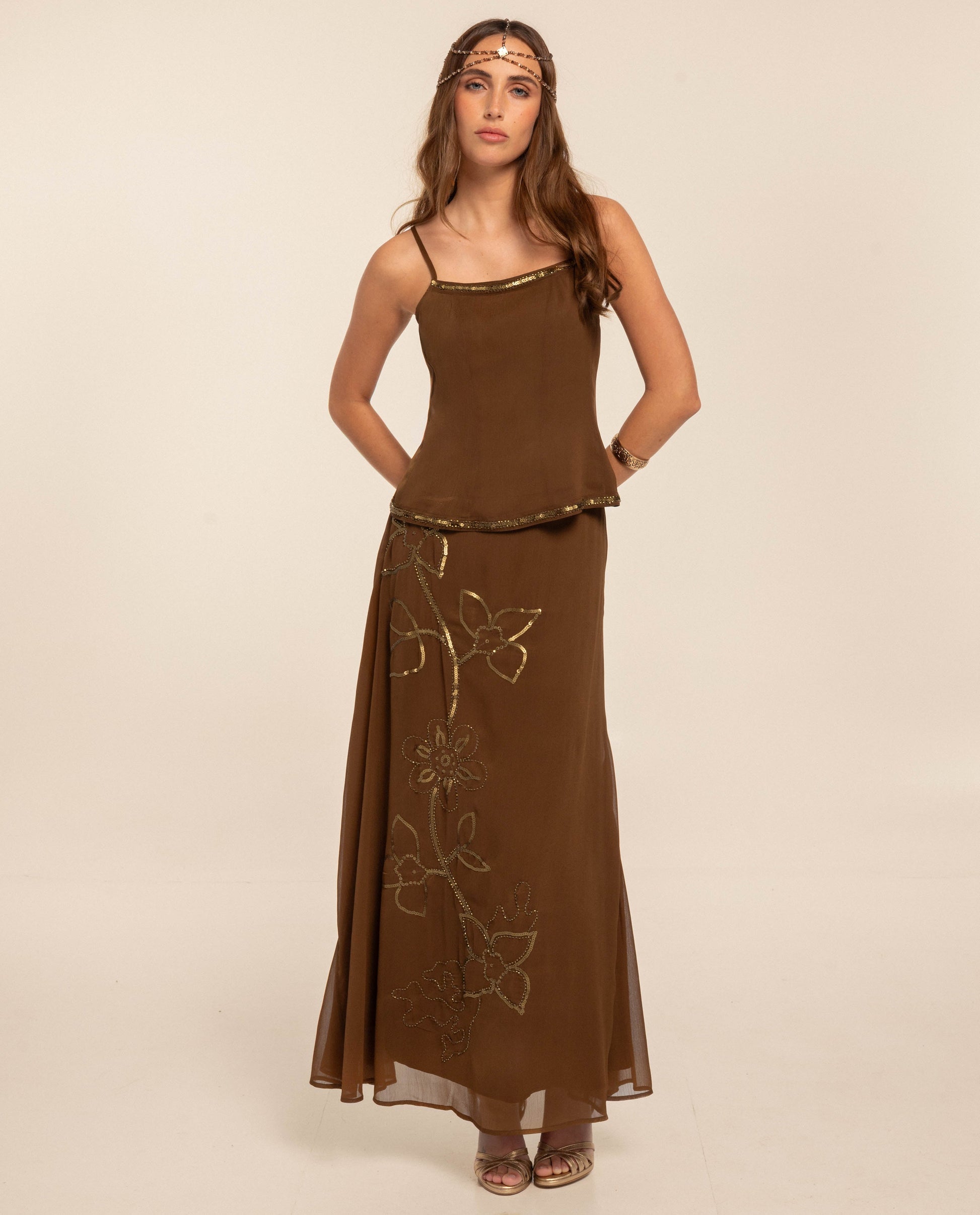 Top de tirantes con lentejuelas y abalorios[readmore] Uno de los conjuntos más especiales de la colección por sus bordados. Lo hemos diseñado con costadillos para que encaje perfectamente al cuerpo y resalte la silueta. El detalle clave son las cintas de lentejuelas y abalorios en el escote y el bajo. Es una pieza forrada y muy fácil de poner gracias a la cremallera invisible con corchete. Llévalo con su falda a conjunto para un total look ideal. [sizes] La modelo de estudio mide 1.72 y lleva habitualmente la XS de top y 34 de pantalón. De este top lleva la talla XS.