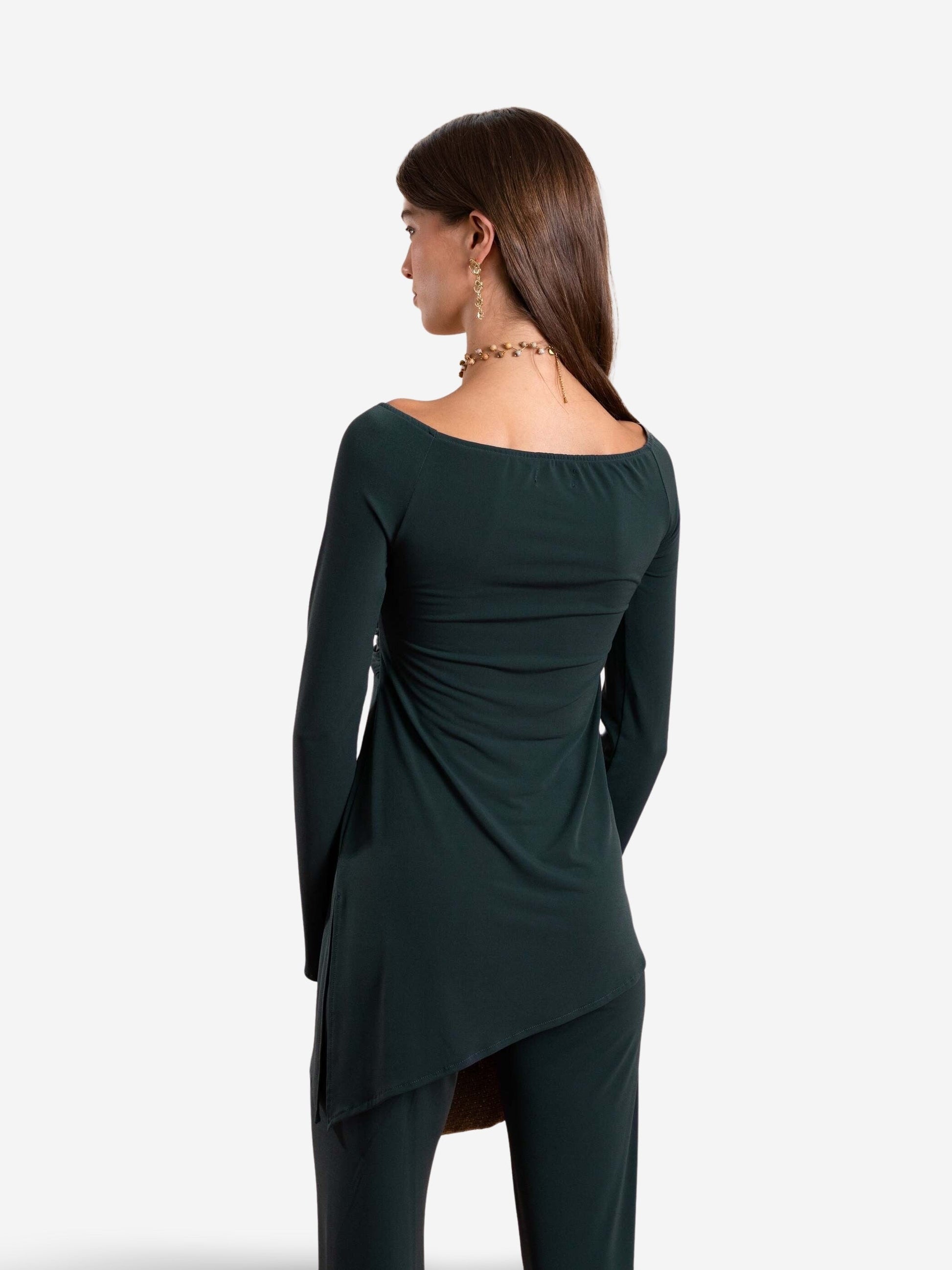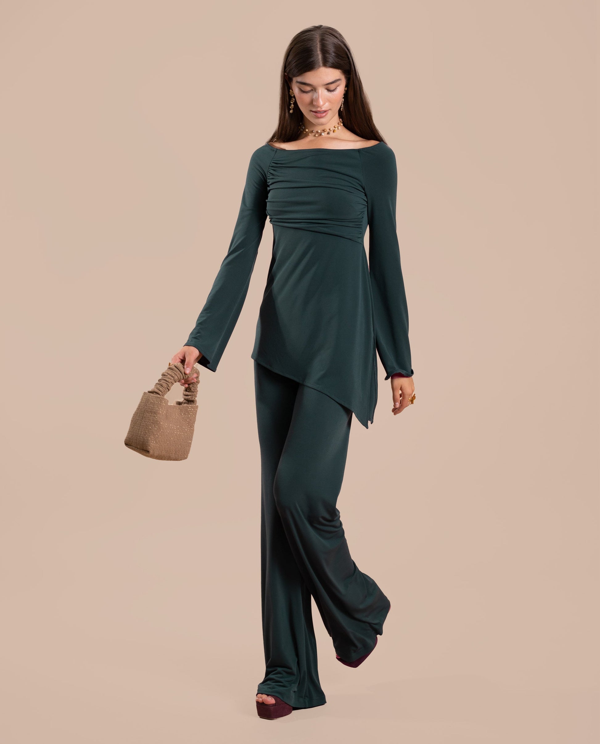 Top elegante de manga larga y escote barco.[readmore]Uno de los conjuntos de invitada más elegantes, cómodos y favorecedores para asistir a un evento. Confeccionado en un tejido de punto elástico, este total look está compuesto por un top y pantalón. El top tiene las mangas largas acampanadas y un escote barco que deja los hombros semi descubiertos. El detalle del frunce en el cuerpo favorece la silueta, con un efecto óptico que estiliza muchísimo. Tiene el bajo asimétrico con una abertura en el lado derecho para mayor comodidad.