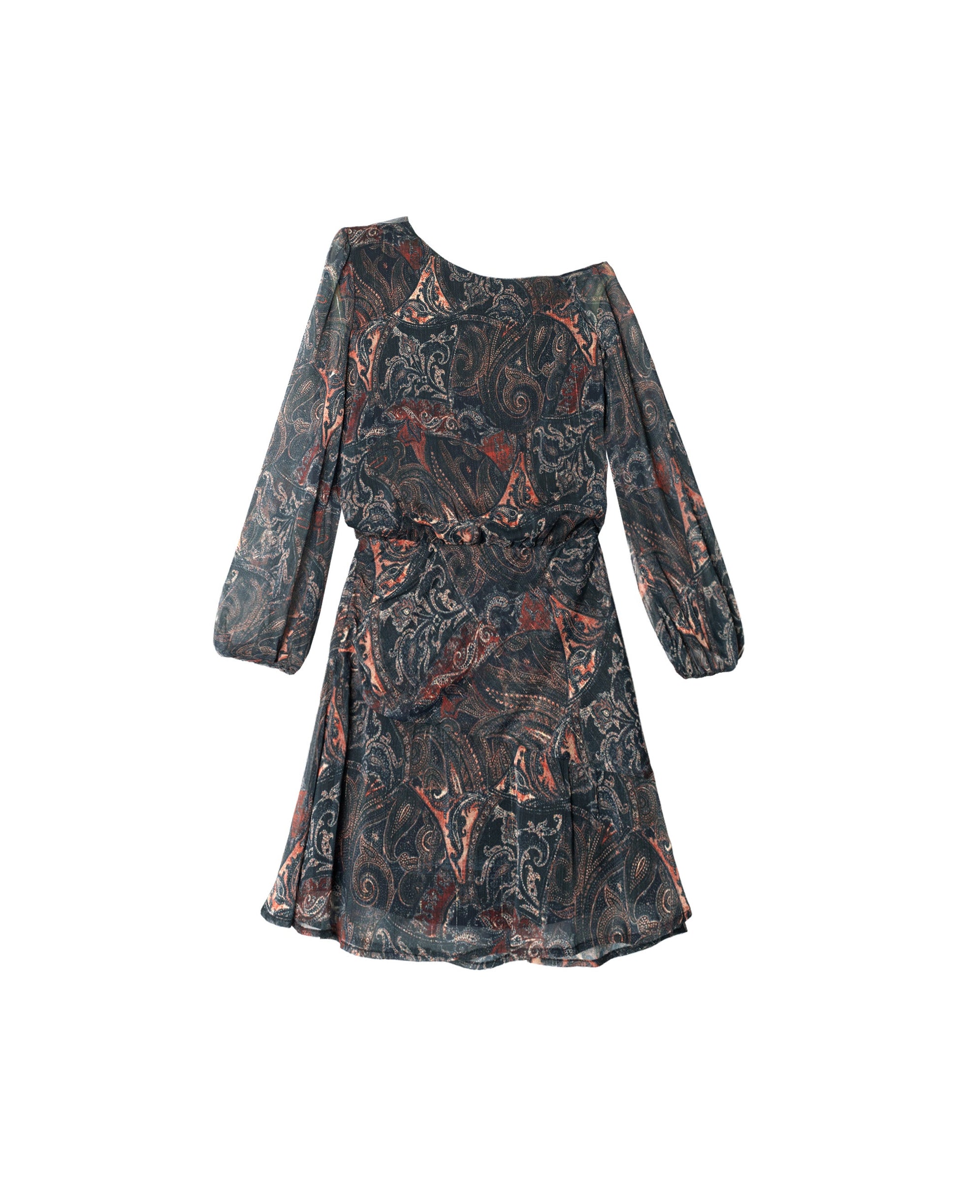 Vestido corto estampado con escote asimétrico y manga larga.[readmore]Un vestido ideal para esos planes que van desde el día hasta la noche. Nuestro equipo lo ha diseñado con manga larga y pieza en cadera, tan de moda! El escote es asimétrico y deja un hombro al aire. El cuerpo hace un efecto ablusado. Va forrado para evitar transparencias. El estampado es de tendencia boho en varios tonos. [sizes]La modelo de estudio mide 1.77 y lleva habitualmente la XS de top y 34 de pantalón. De este vestido lleva la talla XS.