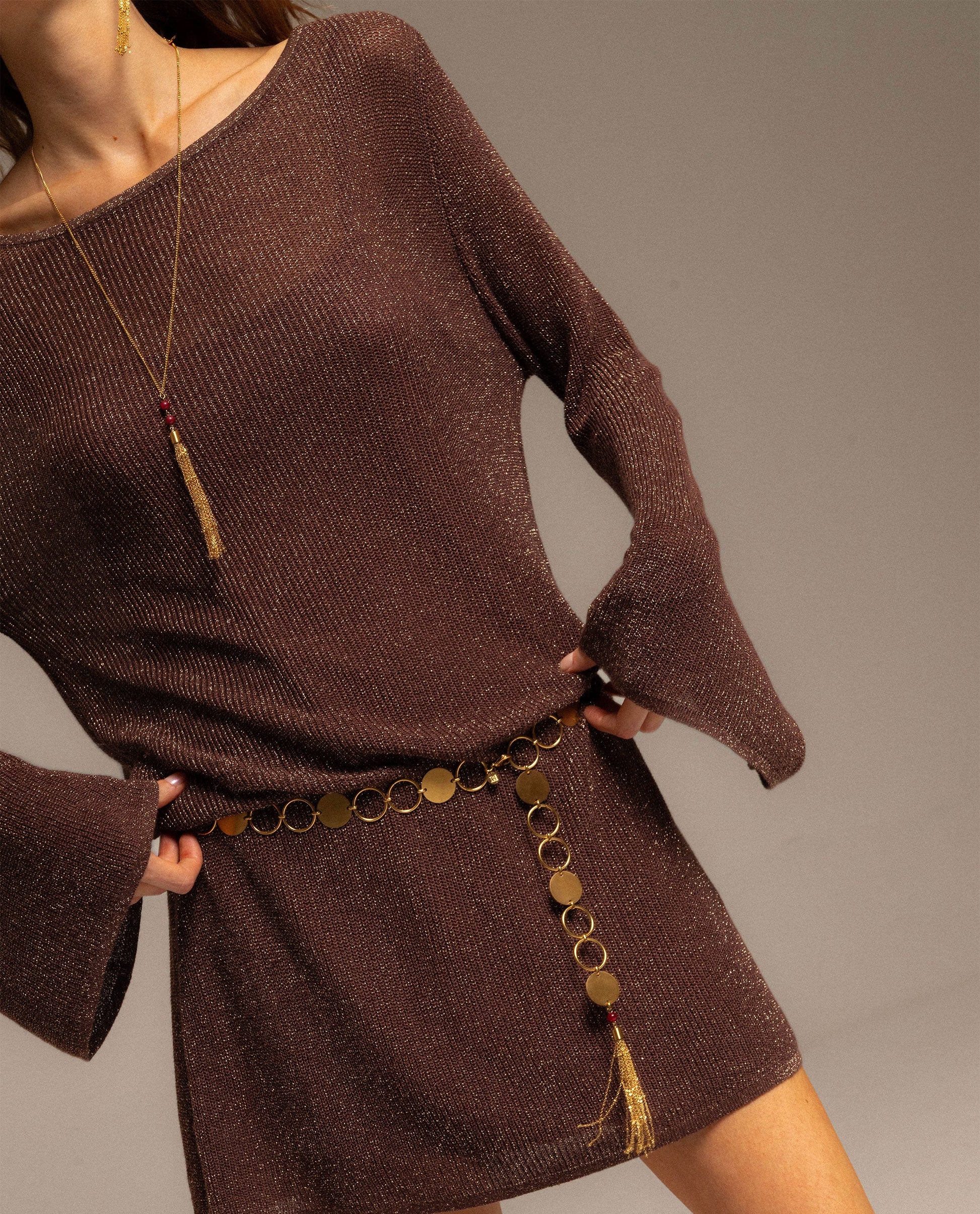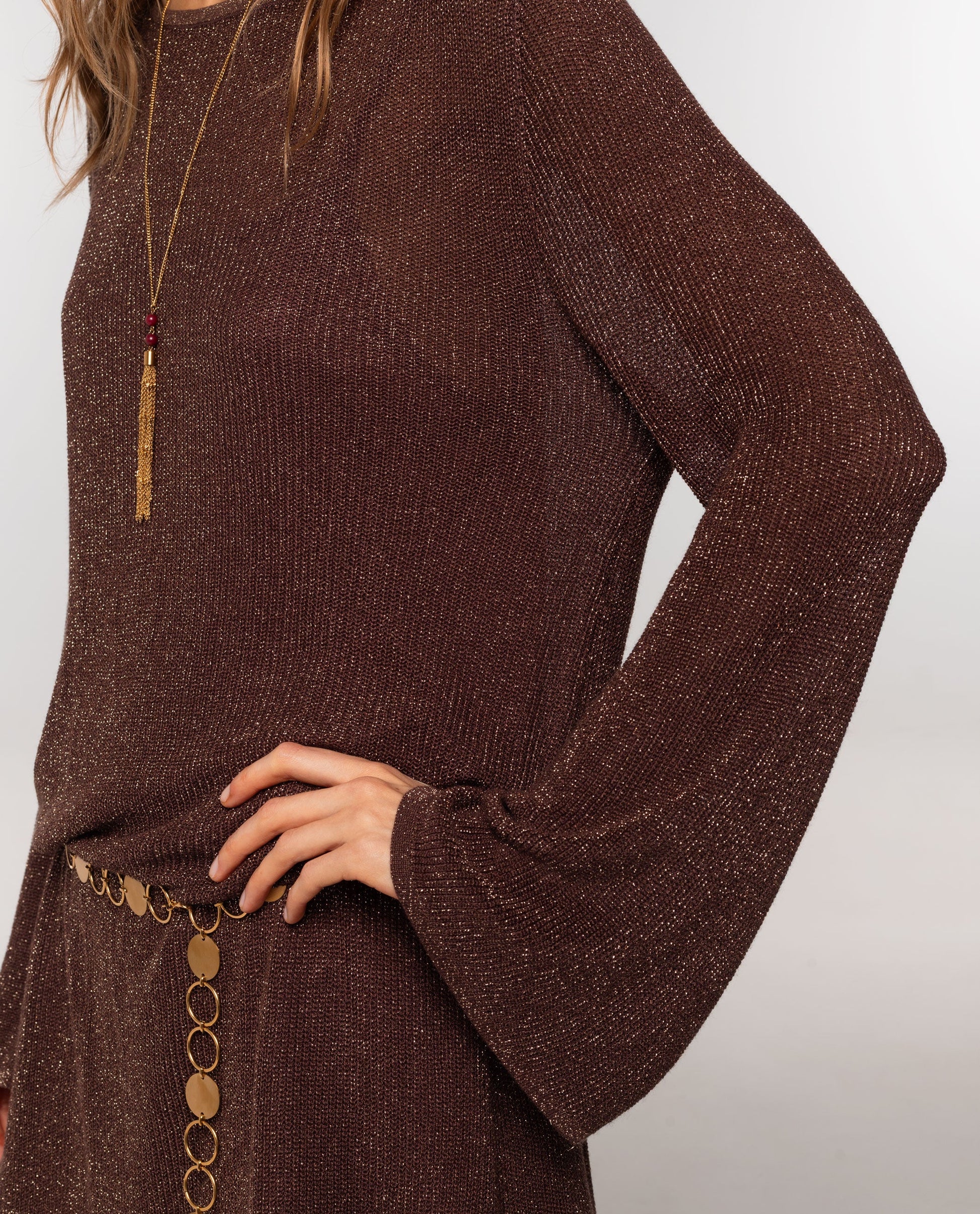 - Tejido de punto con brillo dorado.